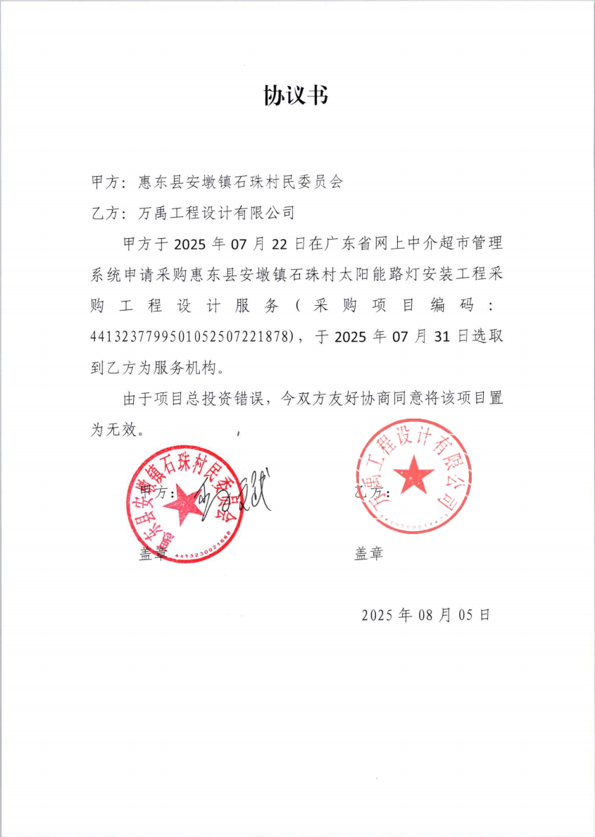 惠东县安墩镇石珠村太阳能路灯安装工程采购工程设计服务采购失败项目公示