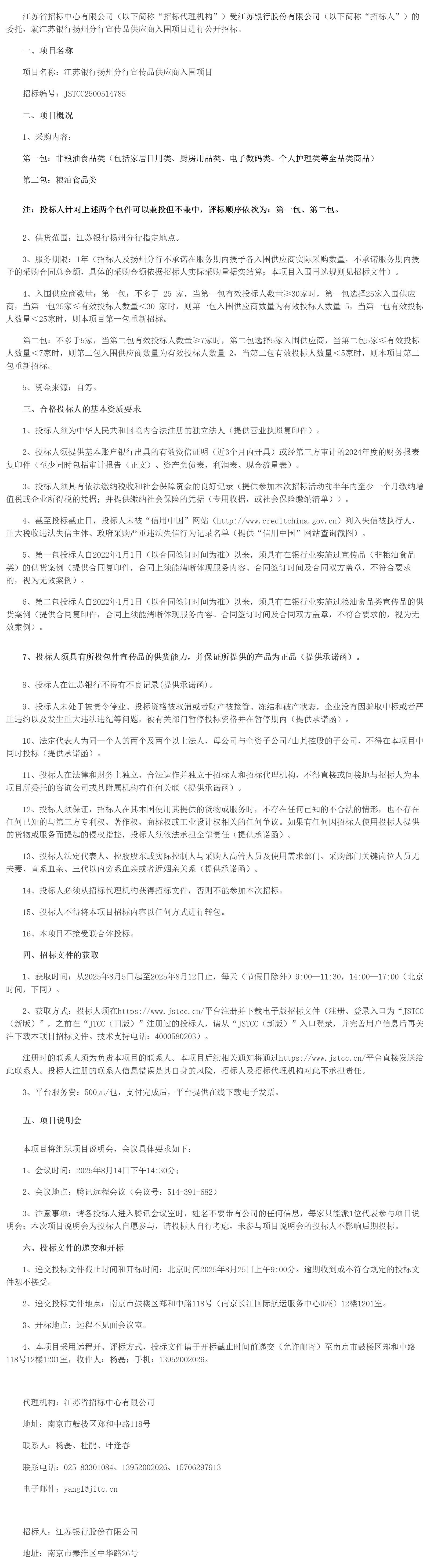 江苏银行扬州分行宣传品供应商入围项目招标公告