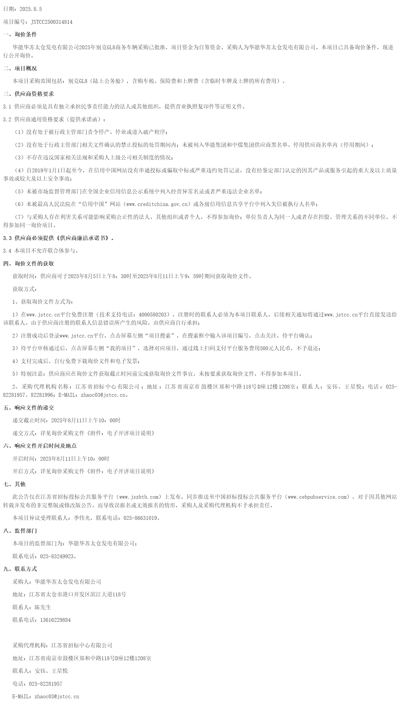 华能华苏太仓发电有限公司****年别克***商务车辆采购已批准,项目资金为自筹资金。采购人为华能华苏太仓发电有限公司。本项目已具备询价条件,现进行公开询价。
