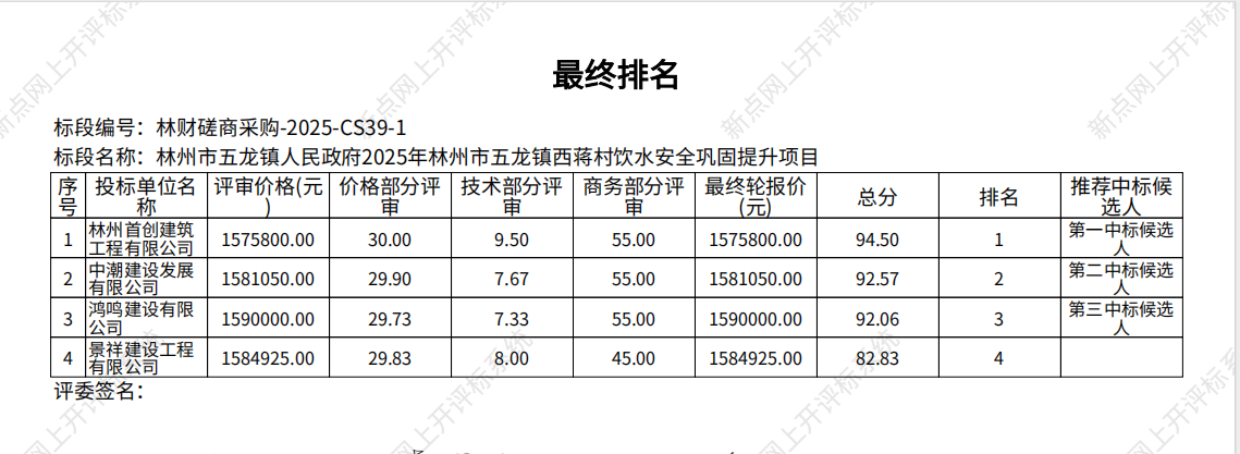 | 评标结果如下: 第一中标候选供应商:林州首创建筑工程有限公司技术和商务:**.**分,价格:**.**分,总分:**.**分;第二中标候选供应商:中潮建设发展有限公司技术和商务:**.**分,价格:**.**分,总分:**.**分;第三中标候选供应商:鸿鸣建设有限公司技术和商务:**.**分,价格:**.**分,总分:**.**分;其他中标情况:景祥建设工程有限公司总分:**.**分 。废标情况:无。 各有关当事人对评标结果如有异议者,可以在公告结束之日起七个工作日内,以书面形式向采购人、采购代理机构提出质疑(加盖单位公章且法定代表人签字,并附带相应的证明材料),由法定代表人或其授权代表携带企业营业执照复印件(加盖公章)及授权委托书、本人身份证件(原件)一并提交(邮寄、邮件不予受理),并以质疑函接受确认日期作为受理时间。逾期未提交或未按照要求提交的质疑函将不予受理。 | |||||||||||||||||||||||||||||||