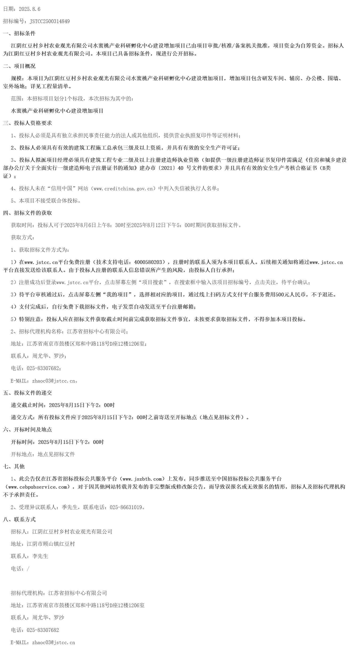 江阴红豆村乡村农业观光有限公司水蜜桃产业科研孵化中心建设增加项目招标公告(***************)