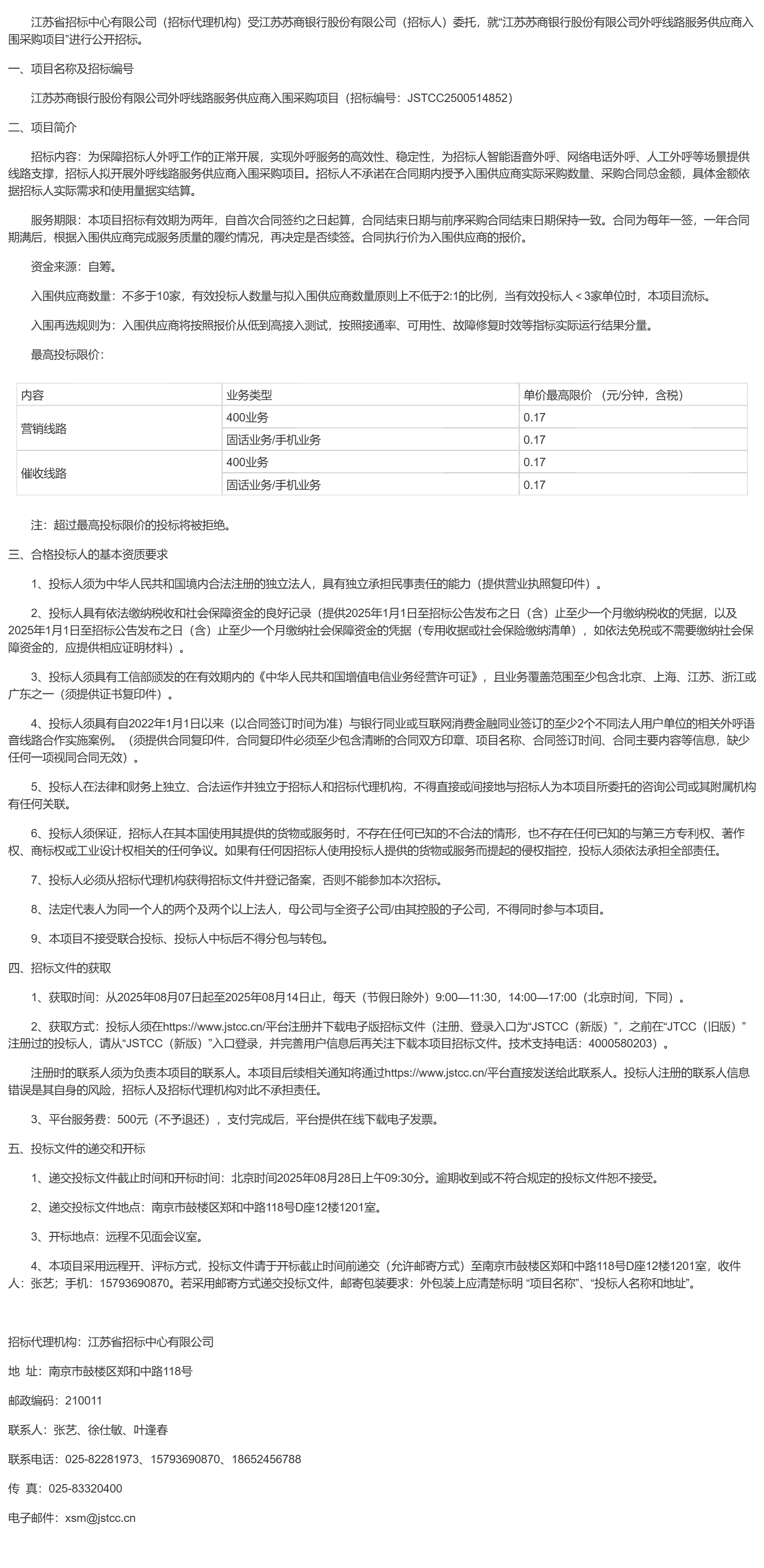 江苏省招标中心有限公司(招标代理机构)受江苏苏商银行股份有限公司(招标人)委托,就“江苏苏商银行股份有限公司外呼线路服务供应商入围采购项目”进行公开招标。