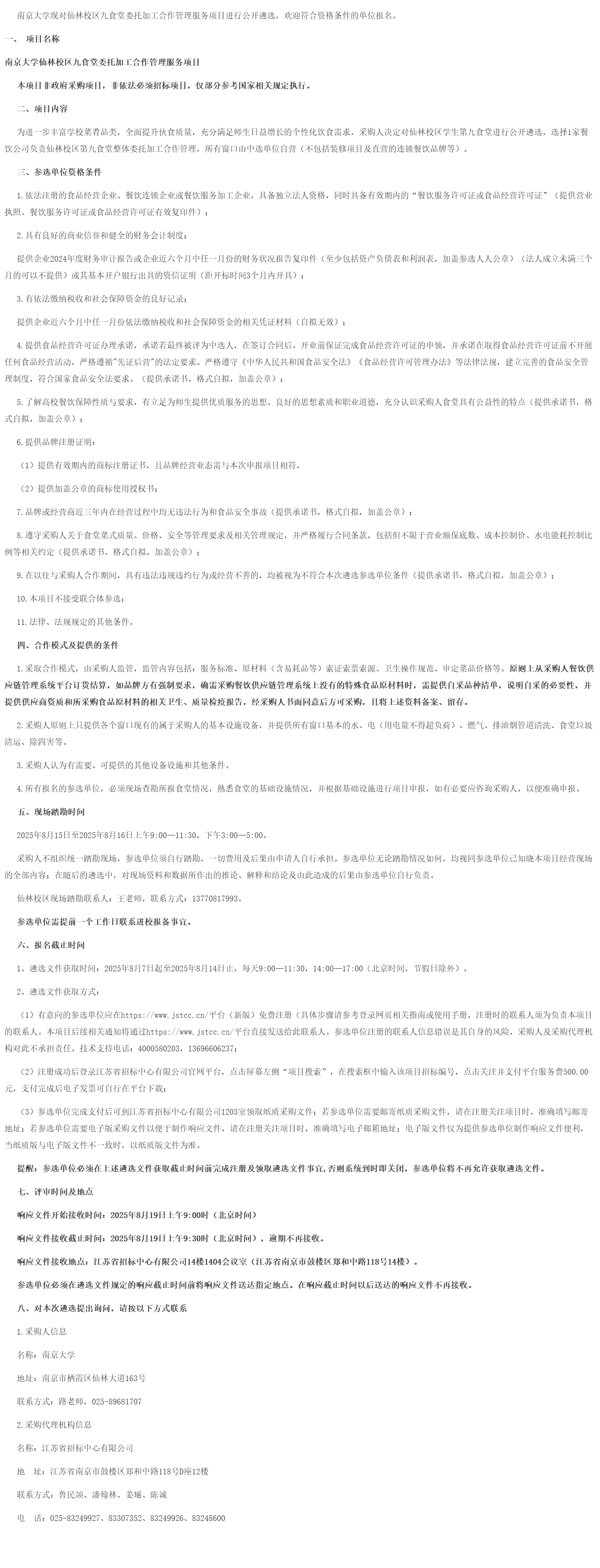 南京大学仙林校区九食堂委托加工合作管理服务项目公开遴选公告