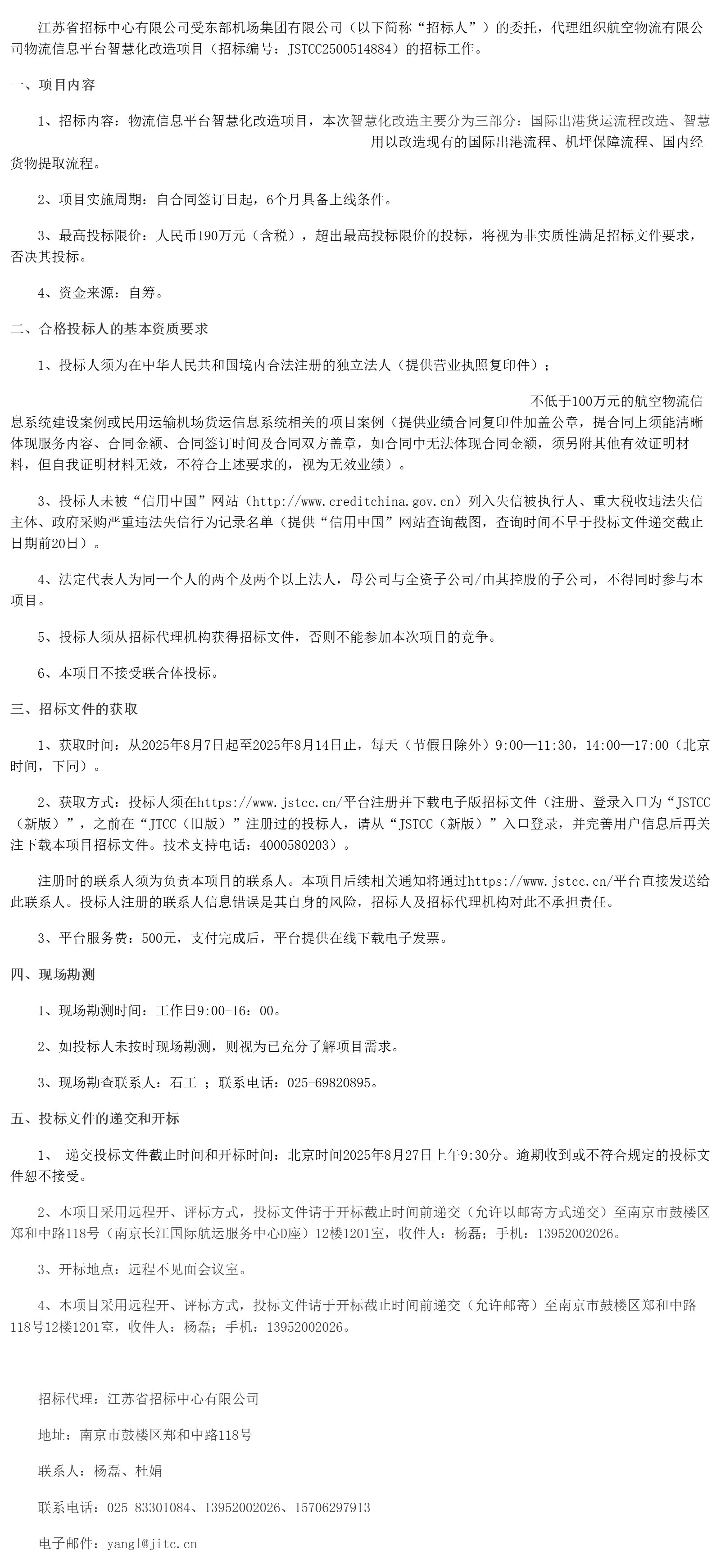 江苏省招标中心有限公司受东部机场集团有限公司(以下简称“招标人”)的委托,代理组织航空物流有限公司物流信息平台智慧化改造项目(招标编号:***************)的招标工作。
