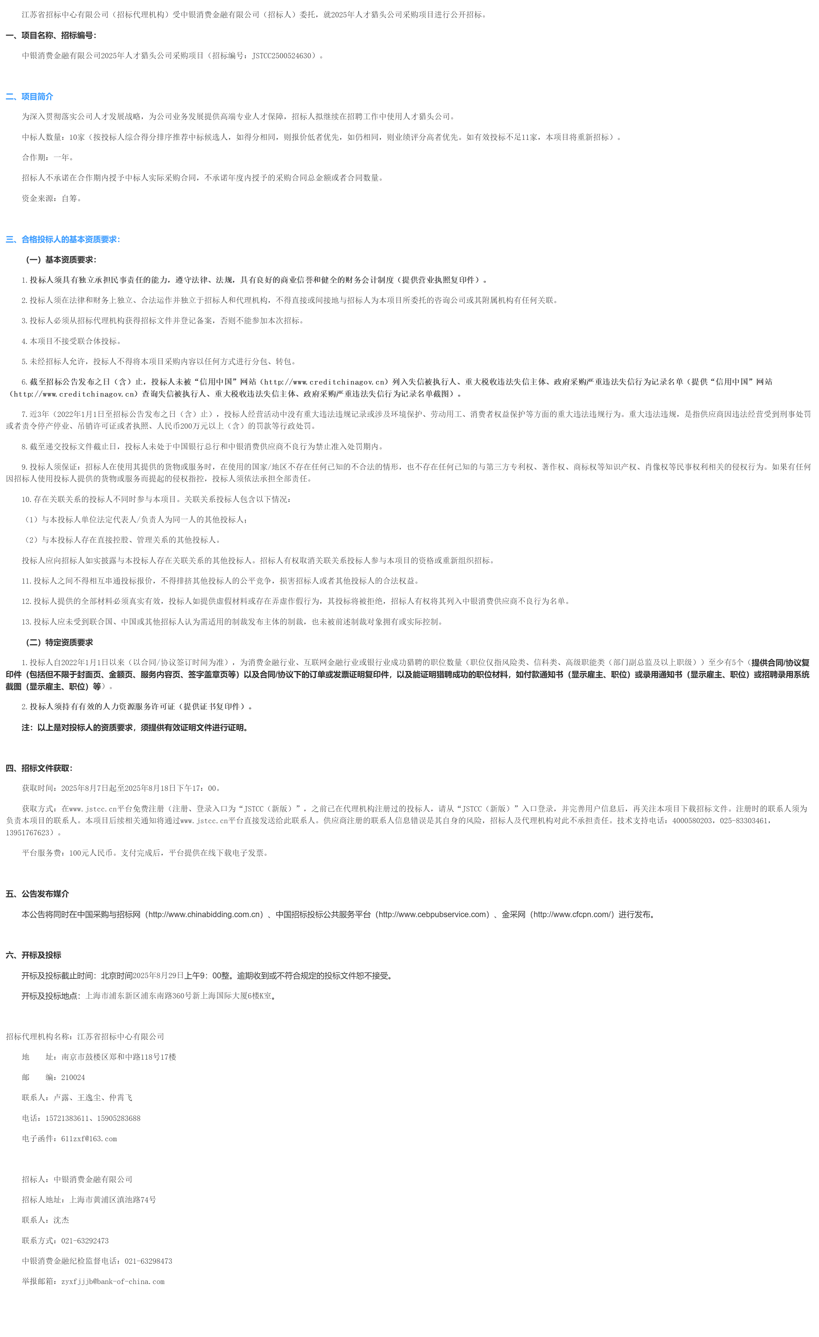 江苏省招标中心有限公司(招标代理机构)受中银消费金融有限公司(招标人)委托,就****年人才猎头公司采购项目进行公开招标。