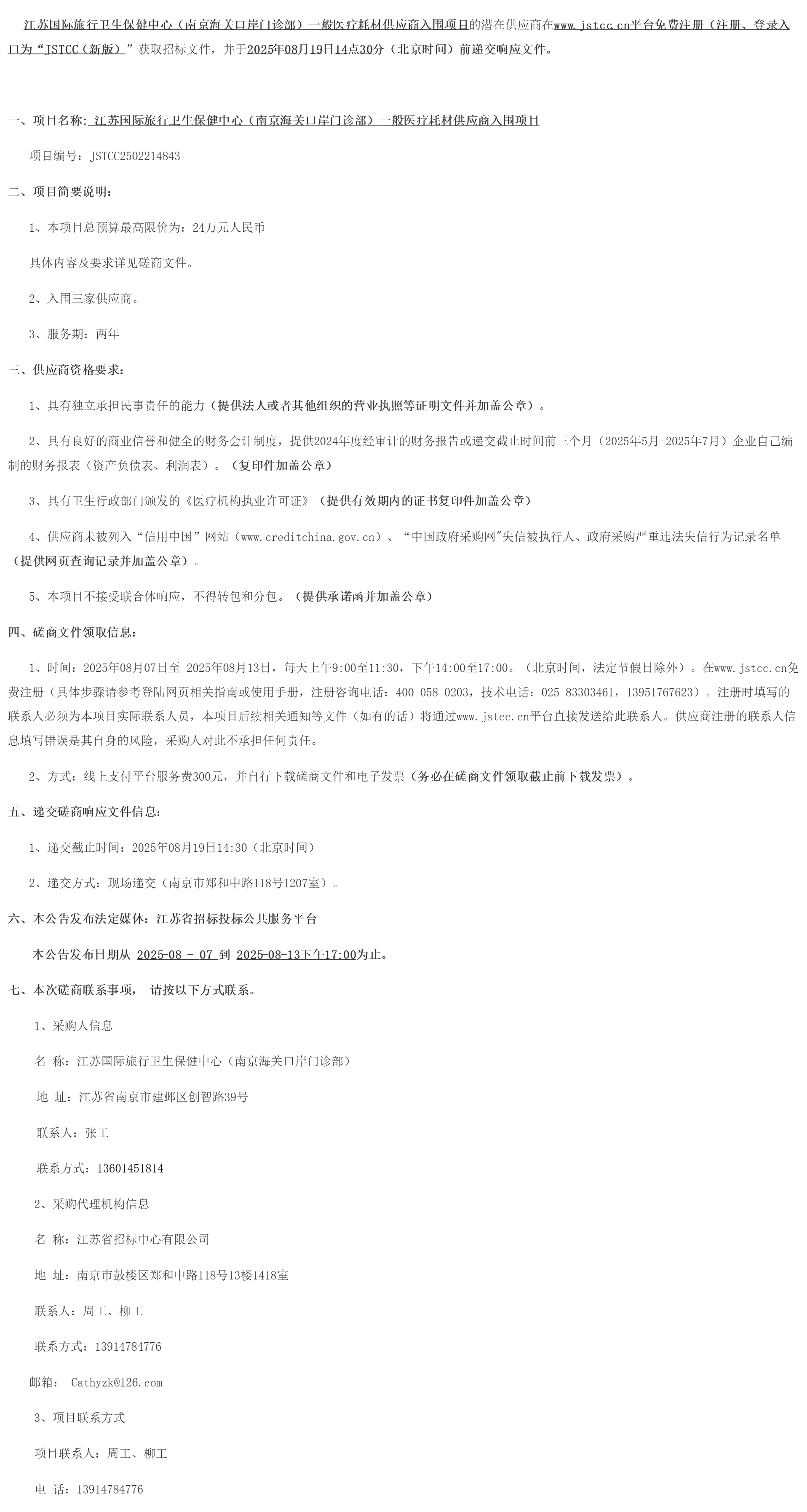 一、项目名称: 江苏国际旅行卫生保健中心(南京海关口岸门诊部)一般医疗耗材供应商入围项目