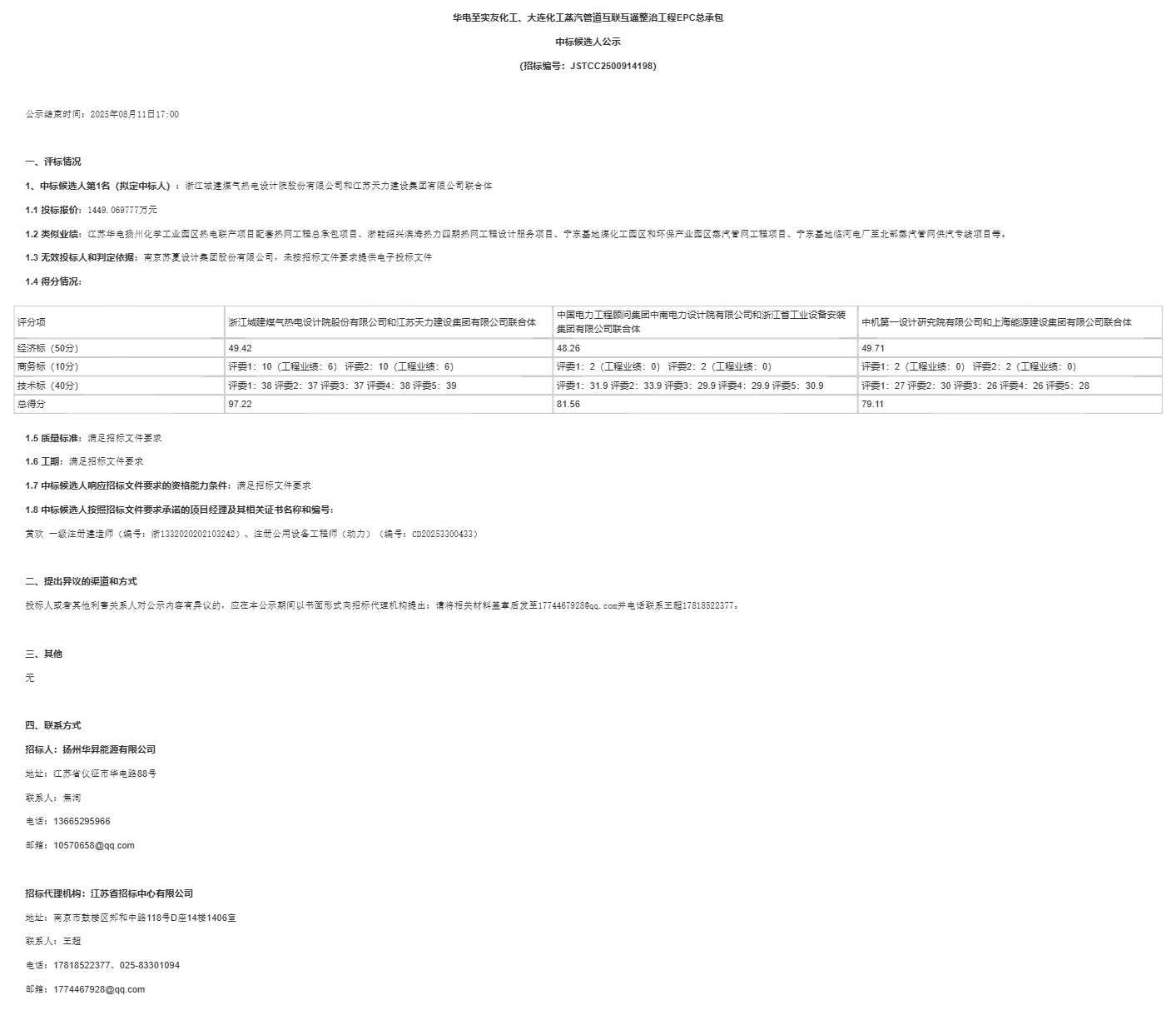 *、中标候选人第*名(拟定中标人):浙江城建煤气热电设计院股份有限公司和江苏天力建设集团有限公司联合体