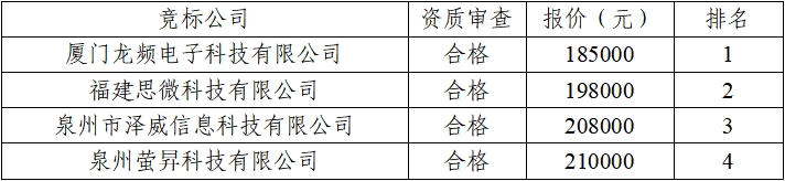 二、按照最低价中标原则,确定本项目中标商:厦门龙频电子科技有限公司。如因自身原因弃标,按名次顺推为中标者。