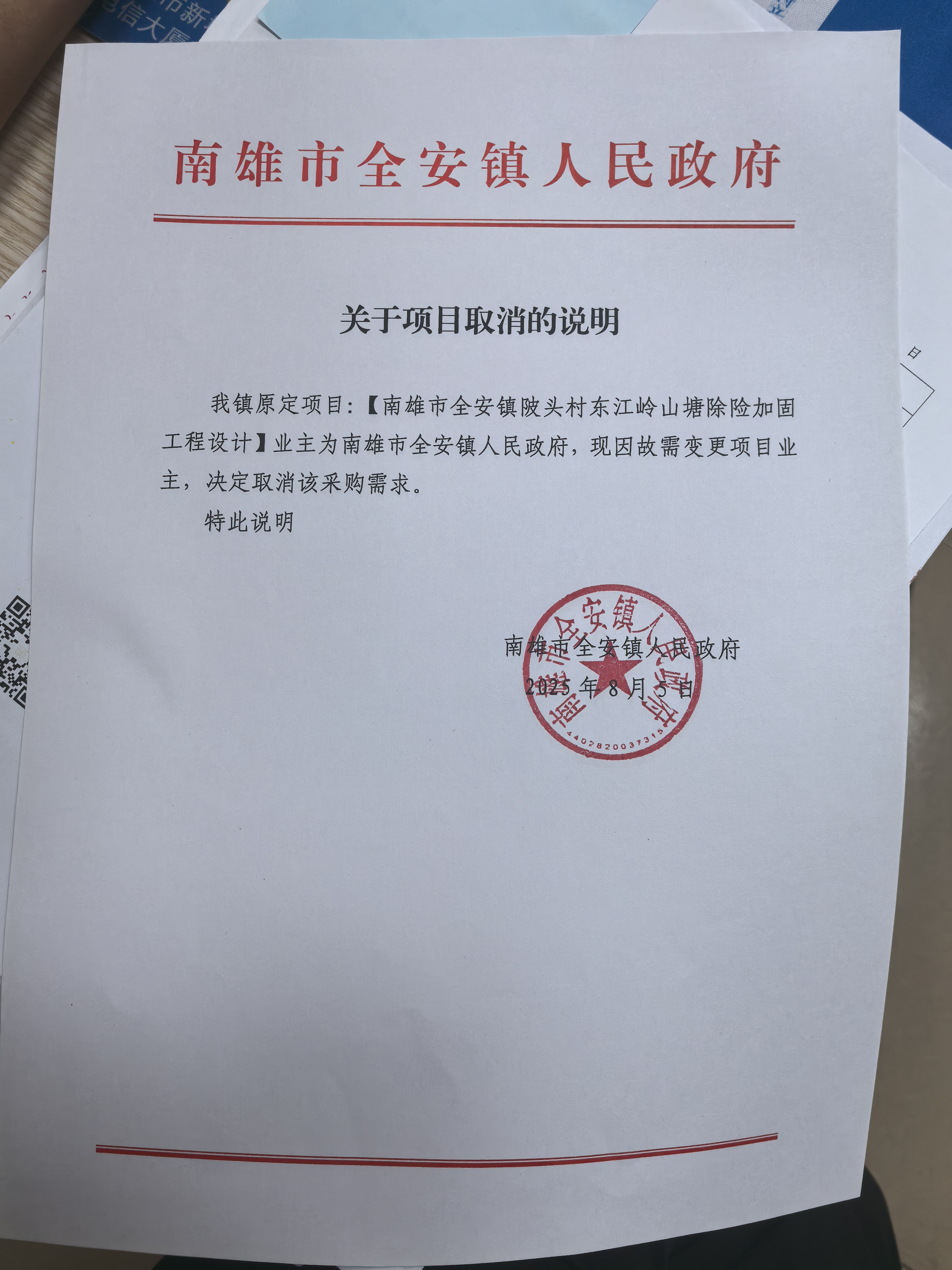 关于【南雄市全安镇陂头村东江岭山塘除险加固工程设计】采购失败项目的公示