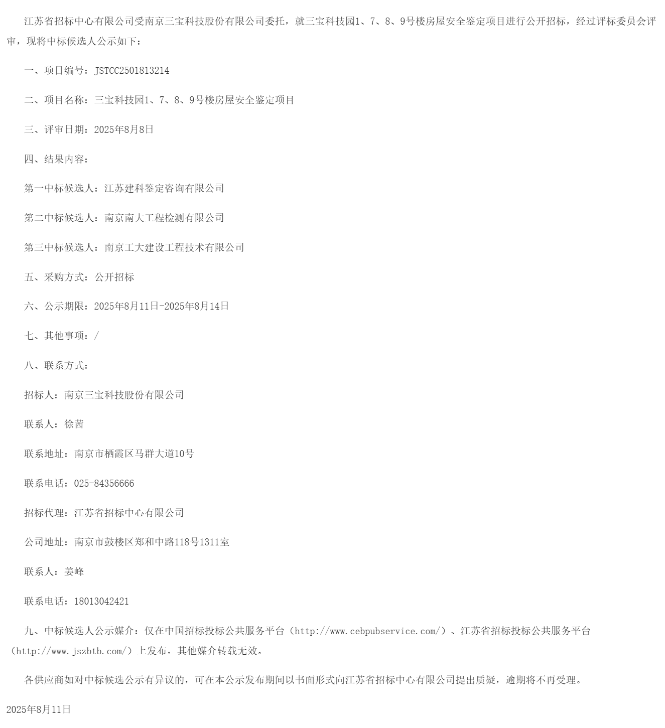 江苏省招标中心有限公司受南京三宝科技股份有限公司委托,就三宝科技园*、*、*、*号楼房屋安全鉴定项目进行公开招标,经过评标委员会评审,现将中标候选人公示如下: