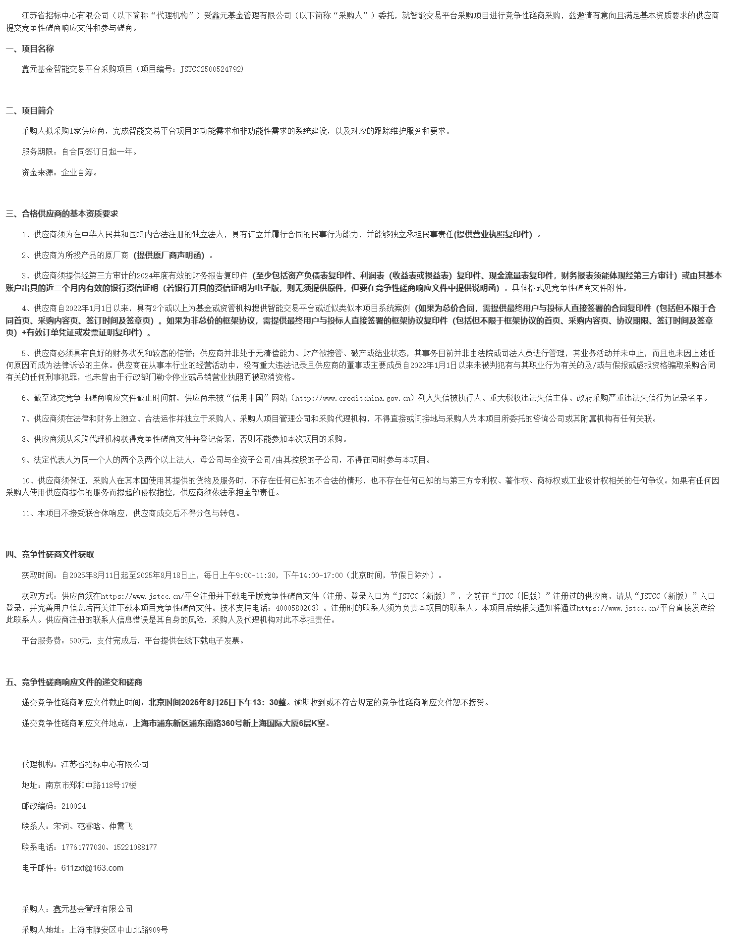 江苏省招标中心有限公司(以下简称“代理机构”)受鑫元基金管理有限公司(以下简称“采购人”)委托,就智能交易平台采购项目进行竞争性磋商采购,兹邀请有意向且满足基本资质要求的供应商提交竞争性磋商响应文件和参与磋商。