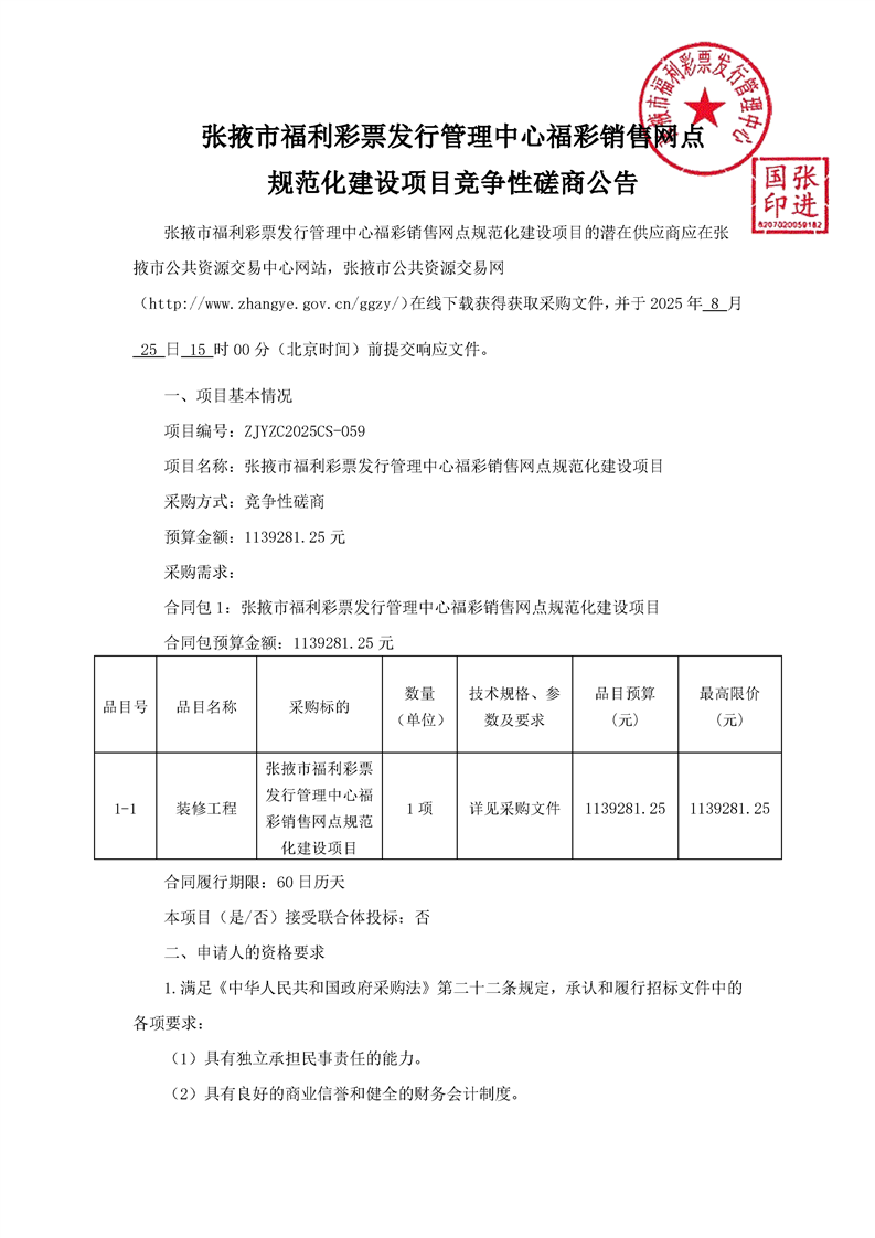 张掖市福利彩票发行管理中心福彩销售网点规范化建设项目竞争性磋商公告采购/资审公告
