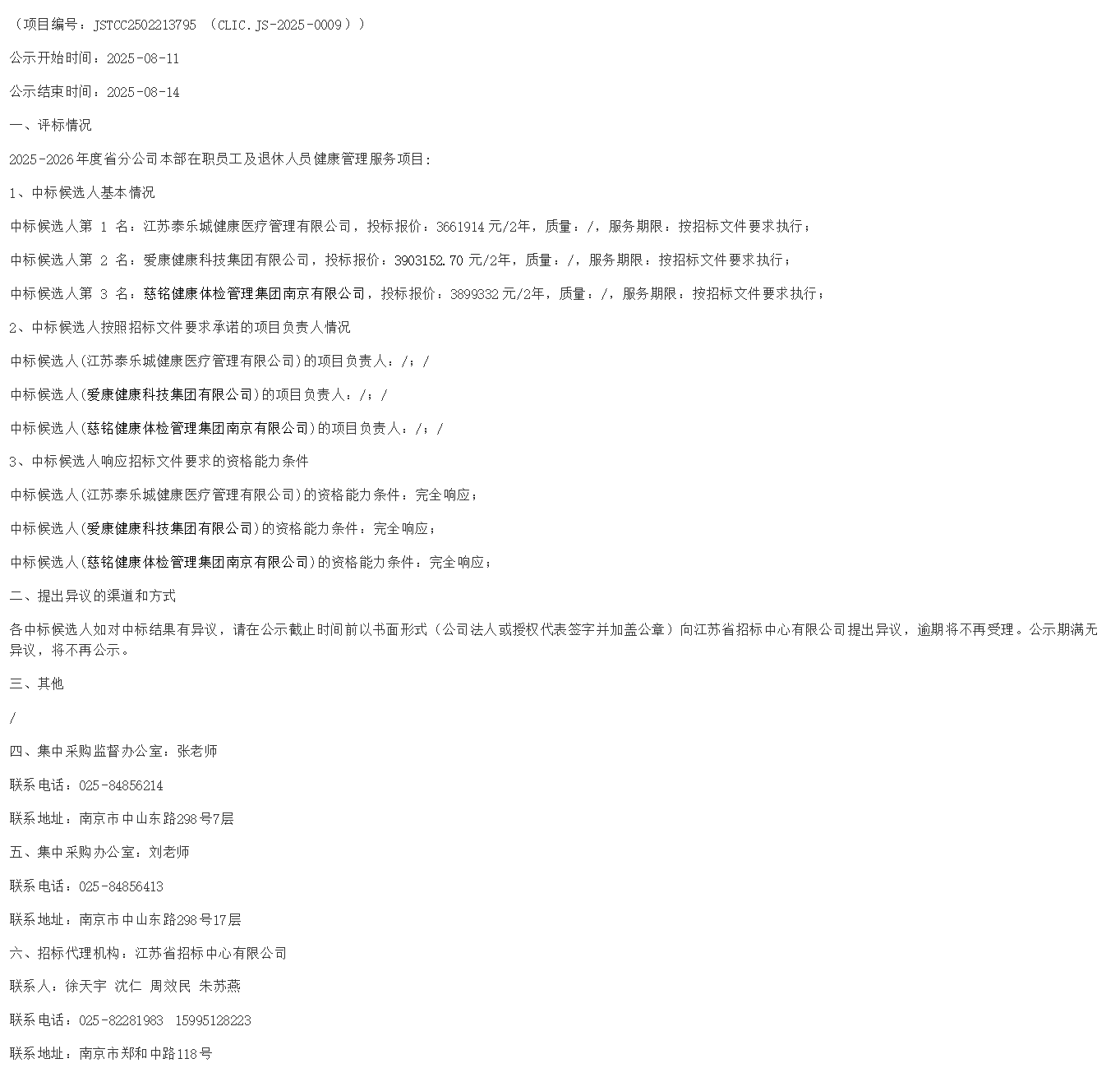 中标候选人第 * 名:慈铭健康体检管理集团南京有限公司,投标报价:*******元/*年,质量:/,服务期限:按招标文件要求执行;