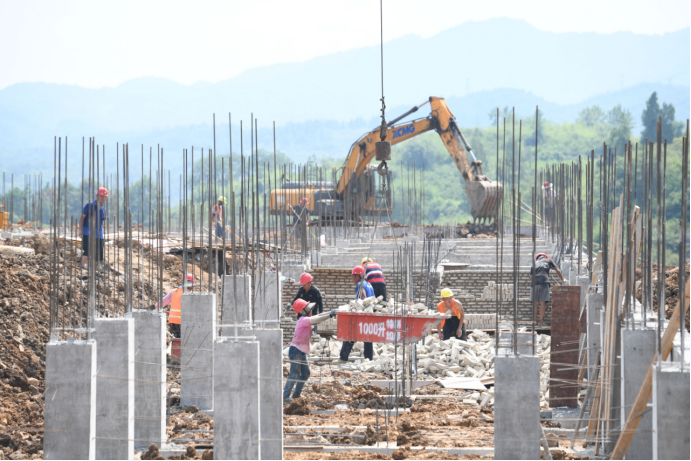 在镇远县畜禽屠宰牛肉深加工与冷链物流城乡配送中心建设项目现场,焊花飞溅,工人们正在进行钢筋绑扎、混凝土浇筑等作业。该项目总投资*亿元,总占地面积**亩,主要建设肉牛屠宰加工生产车间、牛肉丸制品车间、库房等配套设施。项目建成投产后,预计年加工肉牛、羊、猪**万头左右,年营业收入达到**亿元,解决就业***余人,辐射带动一产养殖猪牛等畜禽和种植牧草农户*****户以上。