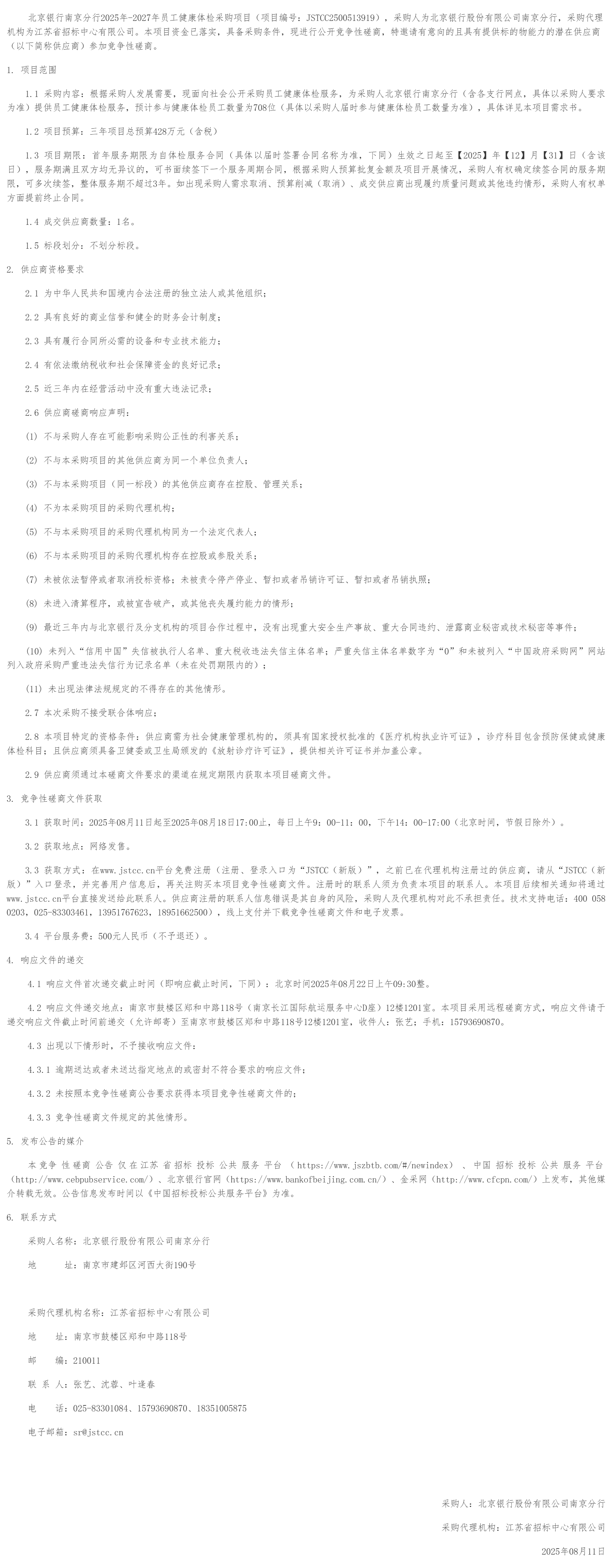 北京银行南京分行****年*****年员工健康体检采购项目采购公告