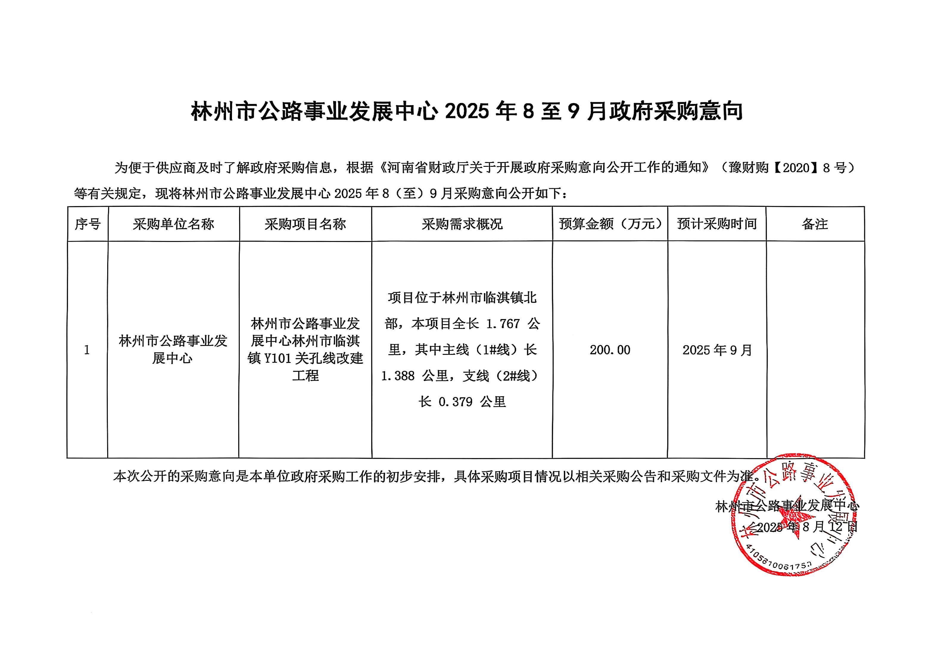 林州市公路事业发展中心2025年8至9月政府采购意向