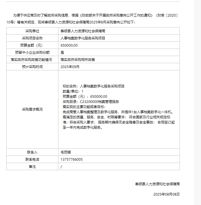 县人力资源和社会保障局2025年8月政府采购意向