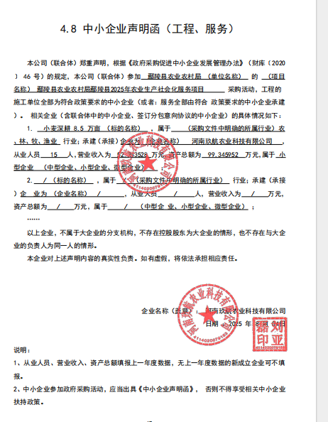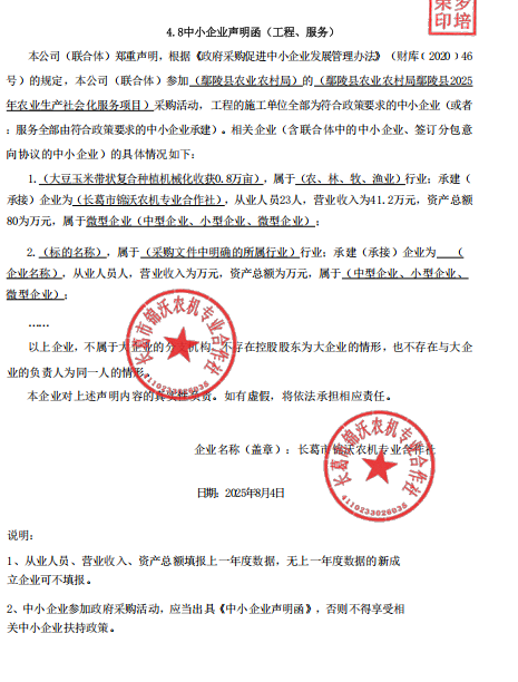 | *、****年度农业社会化服务项目拟在全县粮食种植面积较大,在全县各乡镇种植区内,开展小麦、玉米种肥同播*万亩;大豆玉米带状复合种植机械化收获*.*万亩;小麦深耕*.*万亩;玉米后期一喷多促**万亩。(具体要求详见招标文件)。 *、合同履行期限:自合同签订后*个月内 | |||||||||||||||||||||||||||||||||||||||||||||||||||||||||||||||||||||||||||||||||||||||||||||||||||||||||||||||||||||||||||||||