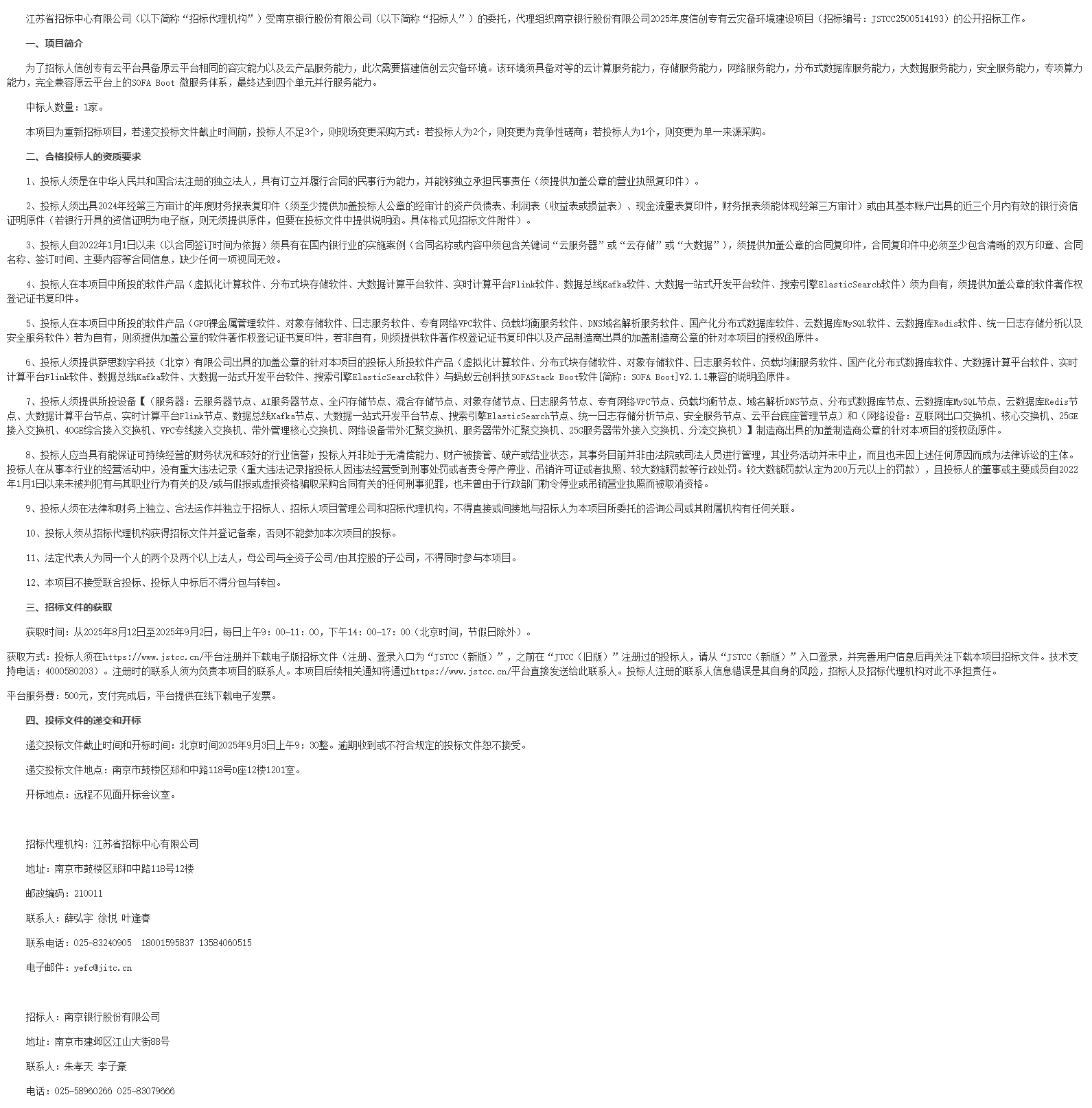 江苏省招标中心有限公司(以下简称“招标代理机构”)受南京银行股份有限公司(以下简称“招标人”)的委托,代理组织南京银行股份有限公司****年度信创专有云灾备环境建设项目(招标编号:***************)的公开招标工作。