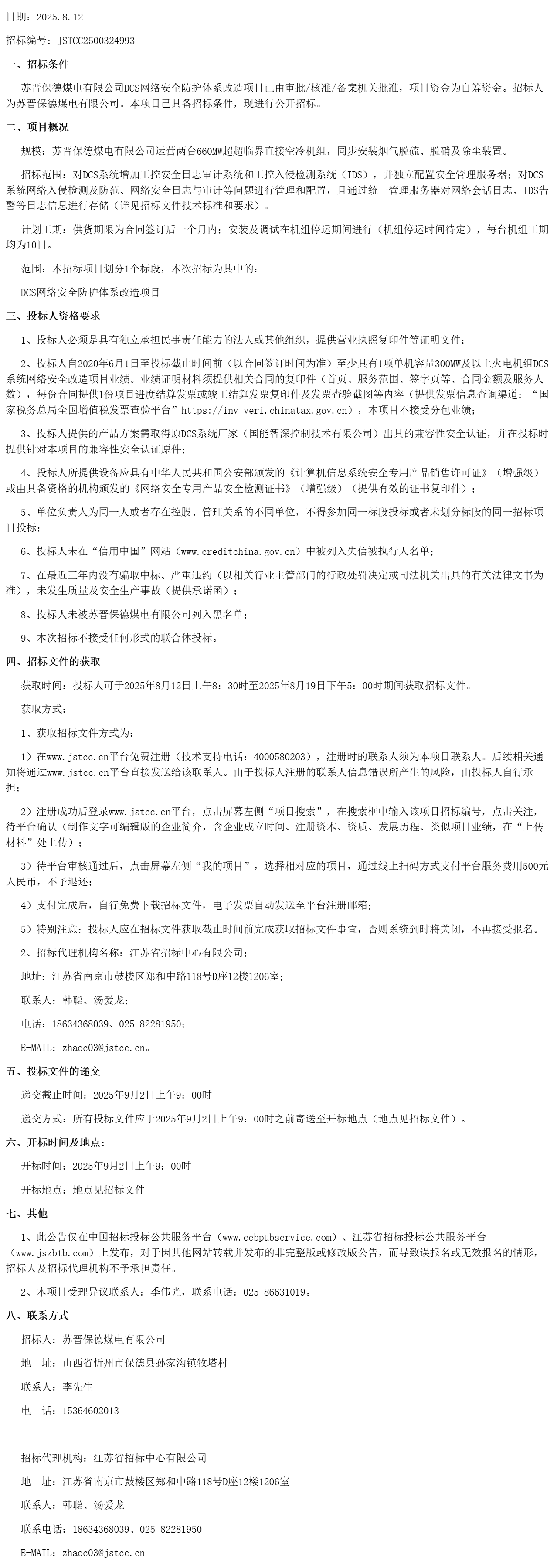 苏晋保德煤电有限公司***网络安全防护体系改造项目招标公告(***************)