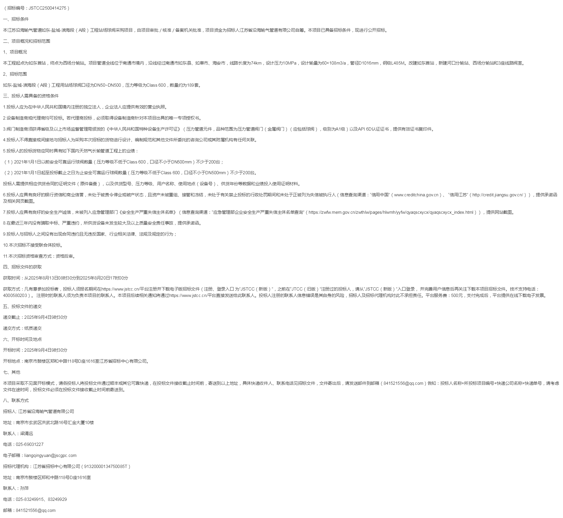 江苏沿海输气管道如东*盐城*滨海段(*段)工程站场球阀采购招标公告