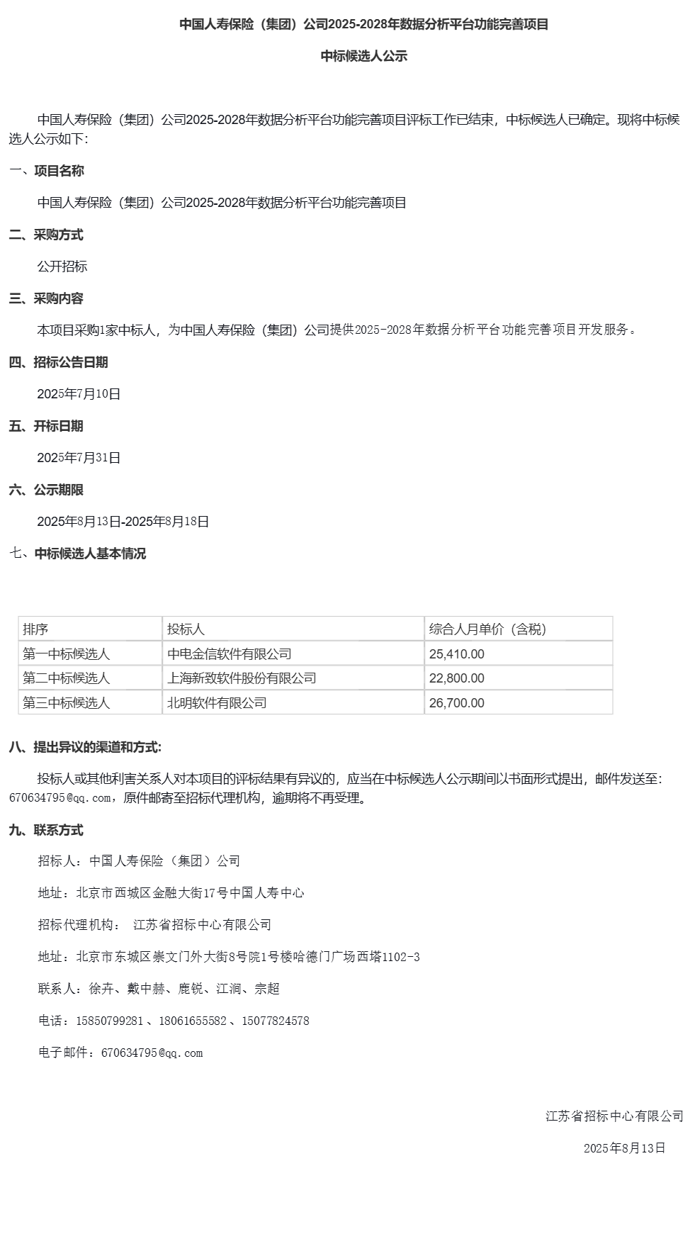 中国人寿保险(集团)公司2025-2028年数据分析平台功能完善项目中标候选人公示