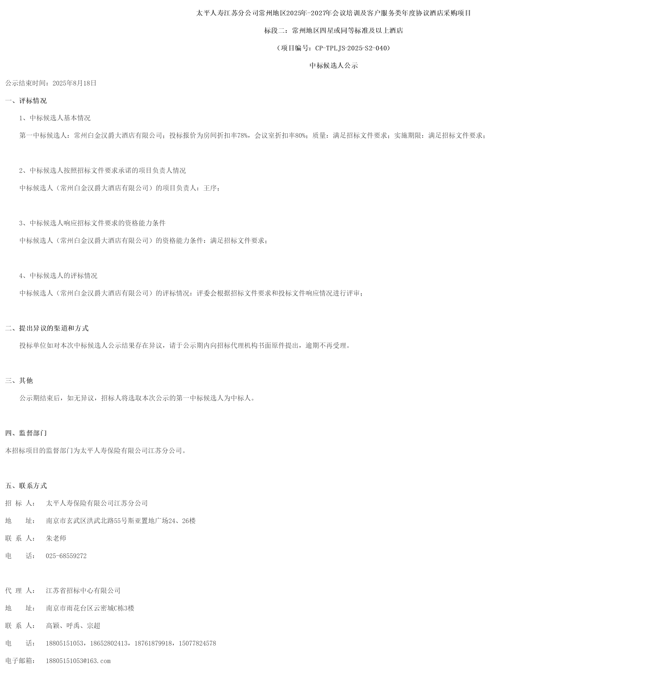 太平人寿江苏分公司常州地区****年*****年会议培训及客户服务类年度协议酒店采购项目(标段二:常州地区四星或同等标准及以上酒店)中标候选人公示