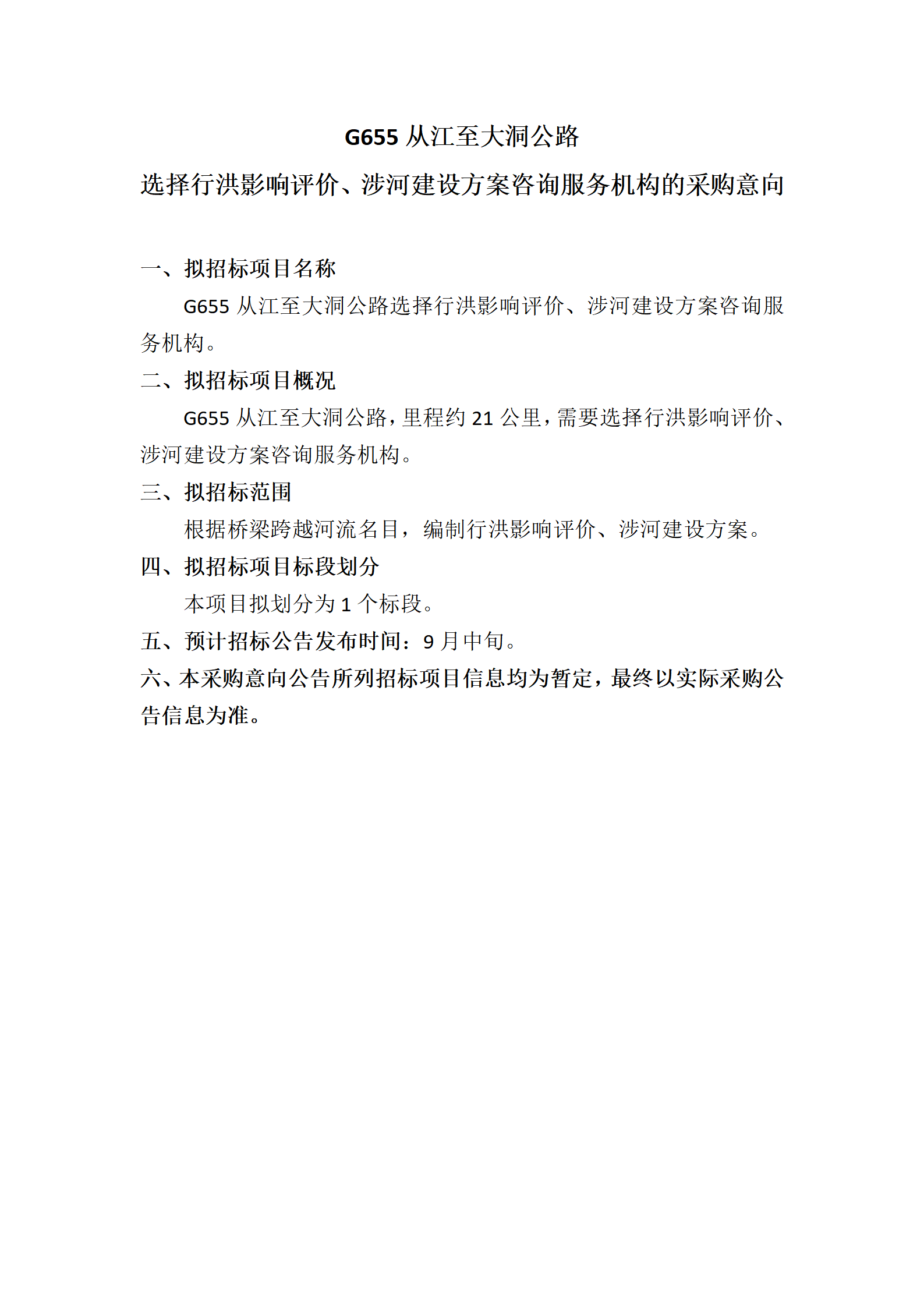 G655从江至大洞公路选择行洪影响评价、涉河建设方案咨询服务机构的采购意向