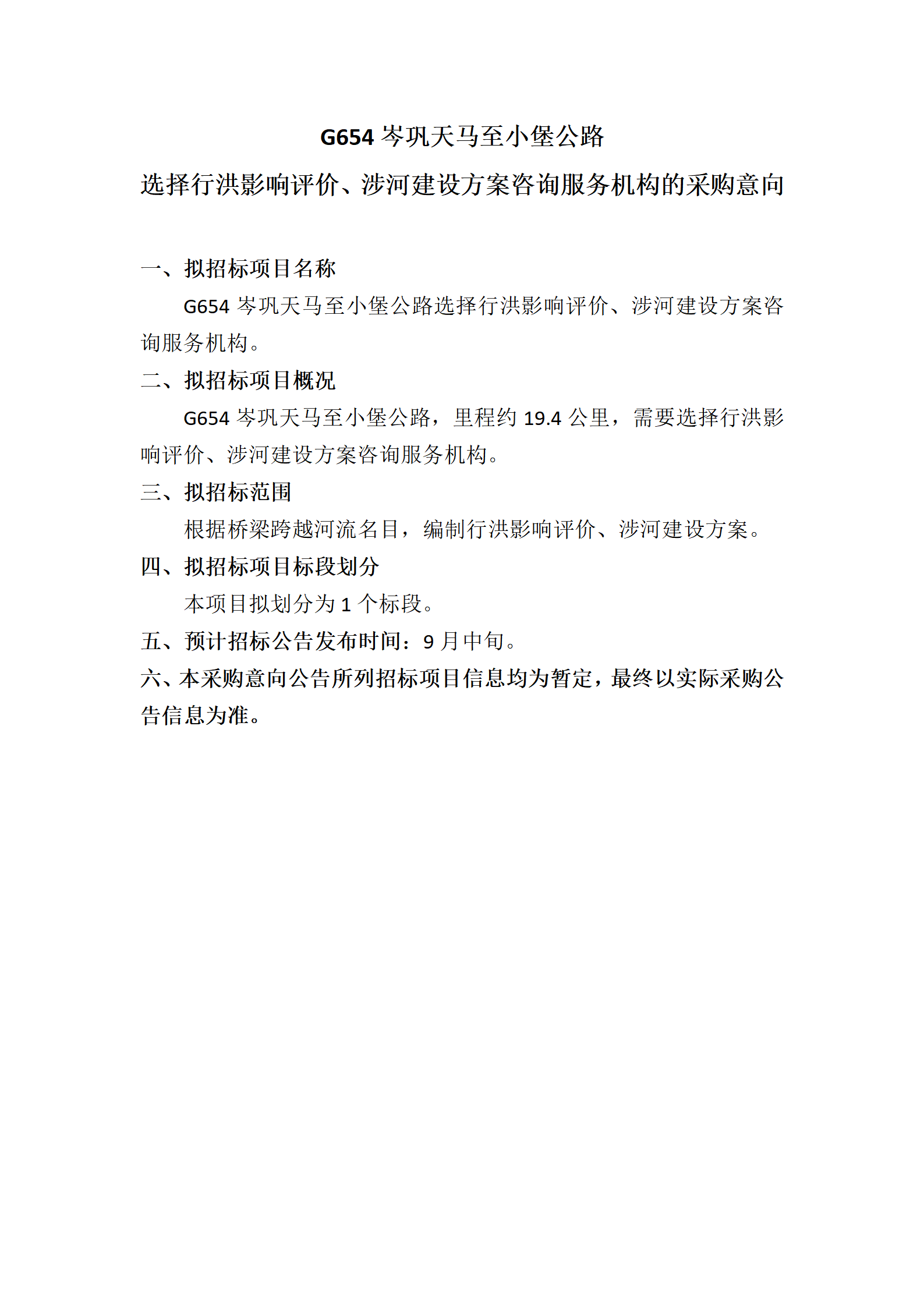 G654岑巩天马至小堡公路选择行洪影响评价、涉河建设方案咨询服务机构的采购意向