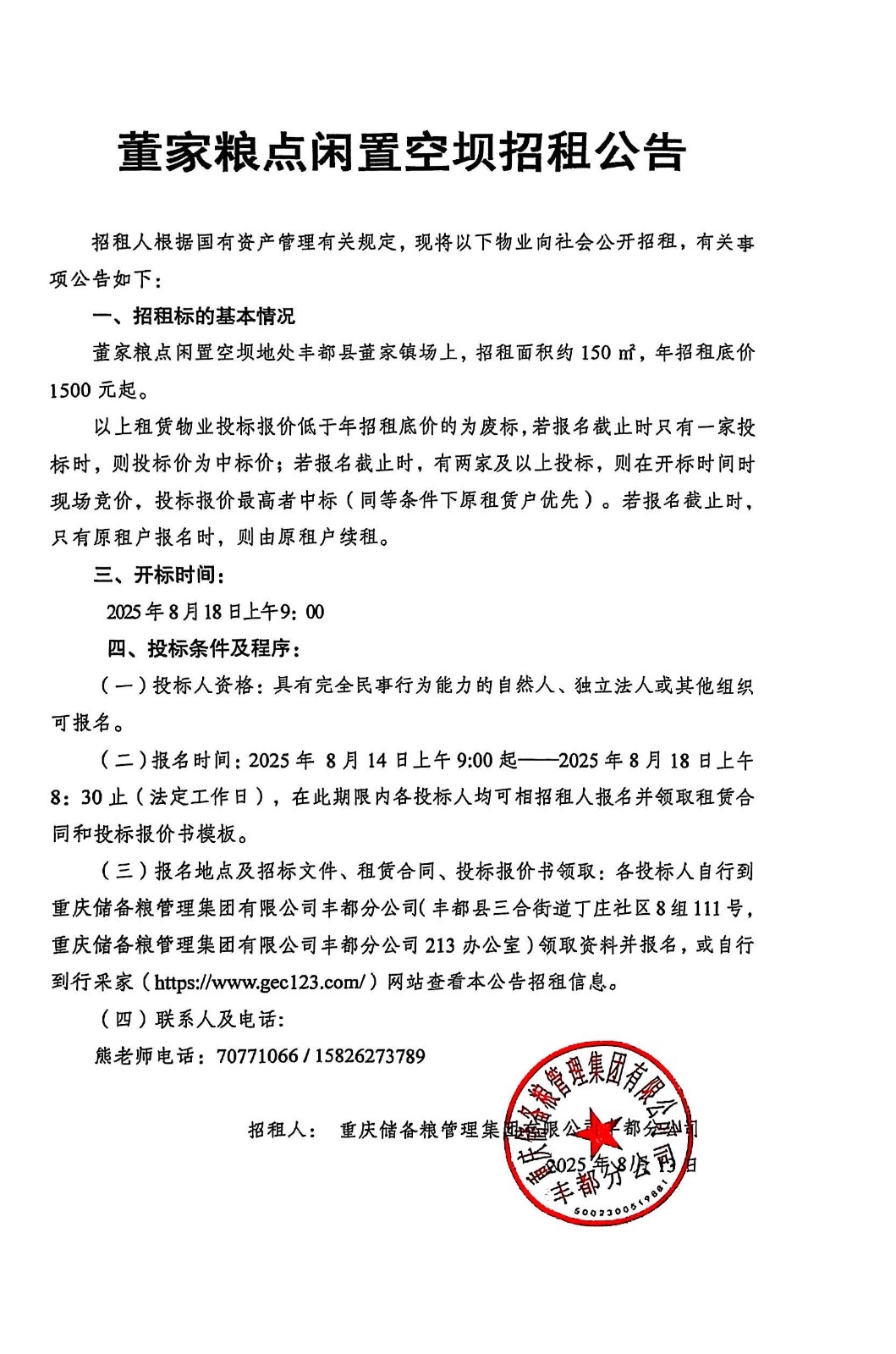 董家粮点闲置空坝地处丰都县董家镇场上,招租面积约***㎡,年招租底价****元起。