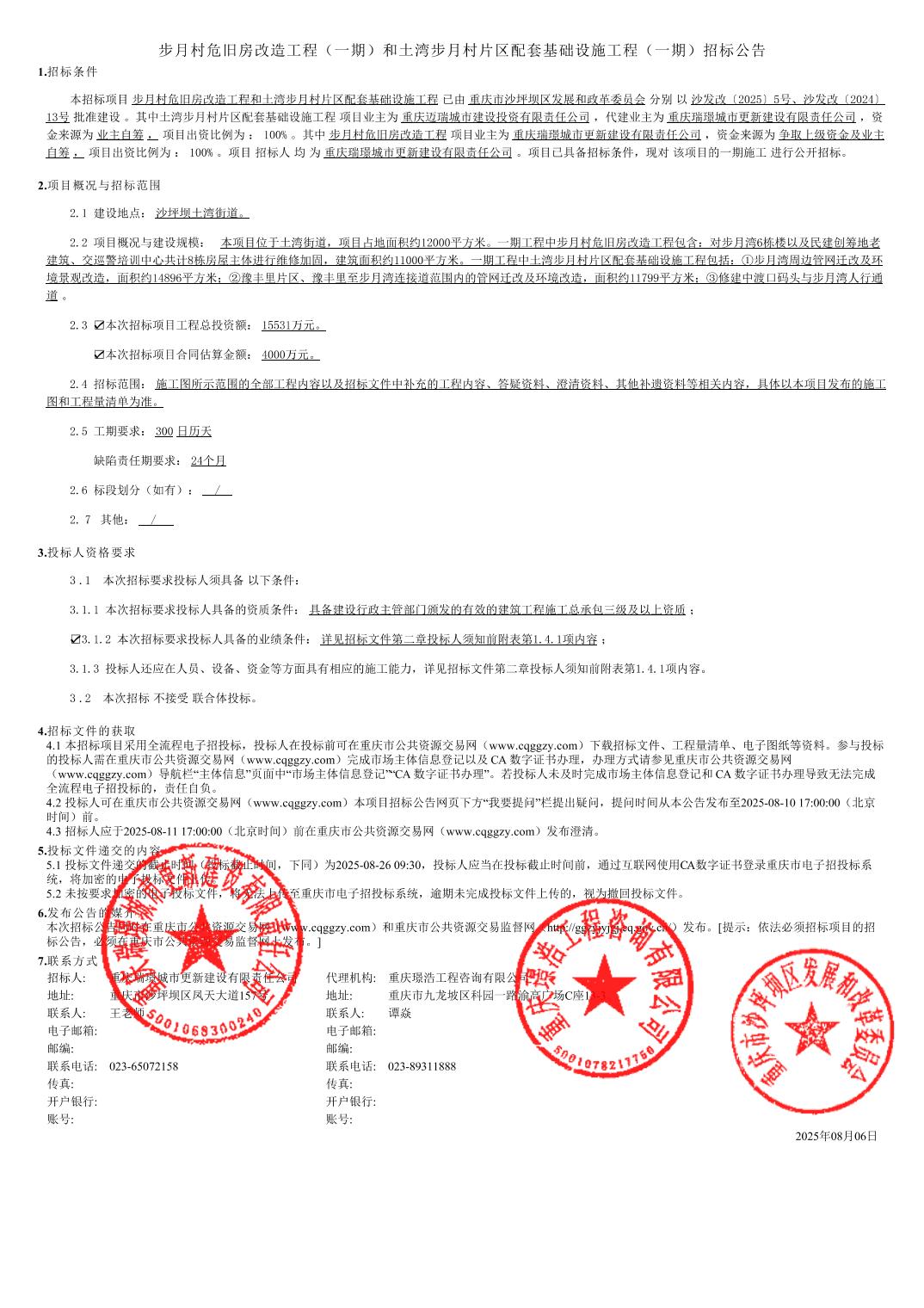 步月村危旧房改造工程(一期)和土湾步月村片区配套基础设施工程(一期)招标公告