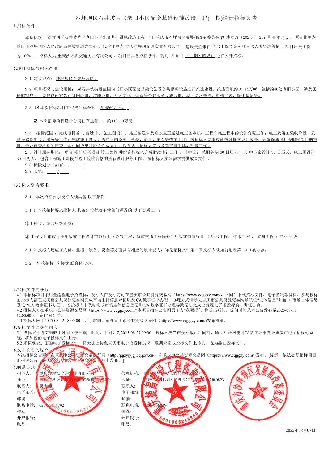 | 名称: | 沙坪坝区石井坡片区老旧小区配套基础设施改造工程(一期)设计招标公告 | ||||