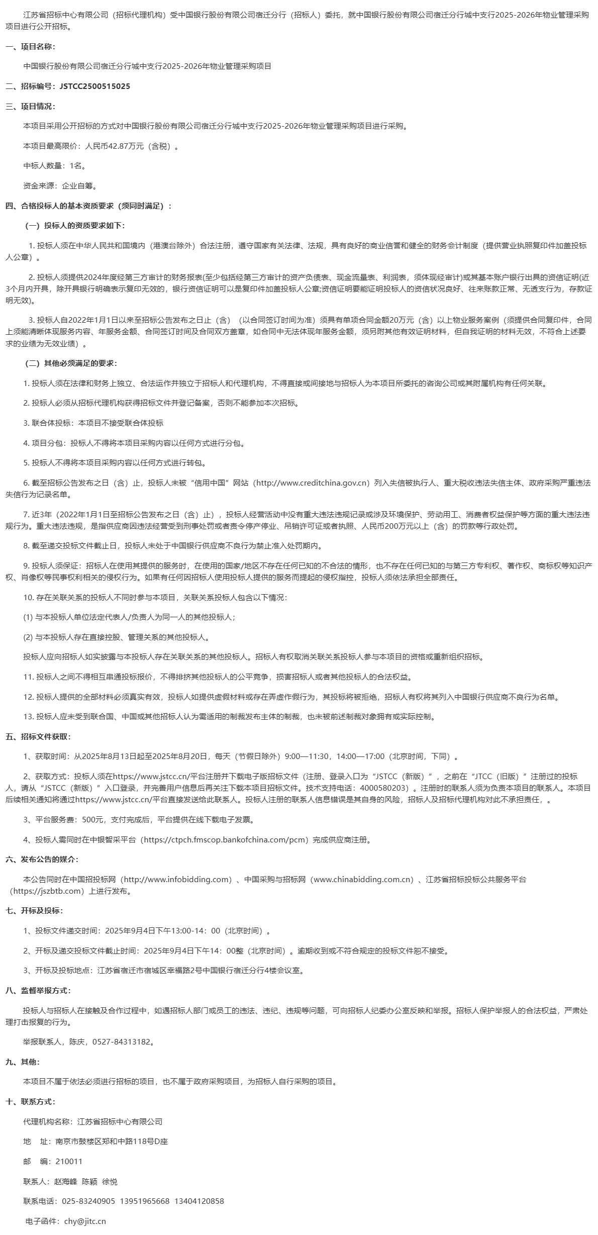 江苏省招标中心有限公司(招标代理机构)受中国银行股份有限公司宿迁分行(招标人)委托,就中国银行股份有限公司宿迁分行城中支行*********年物业管理采购项目进行公开招标。