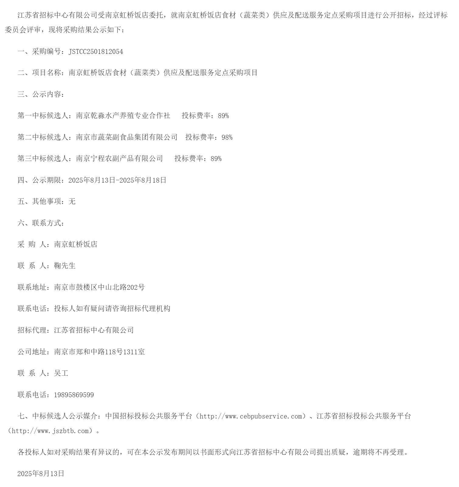 南京虹桥饭店食材(蔬菜类)供应及配送服务定点采购项目中标候选人公示