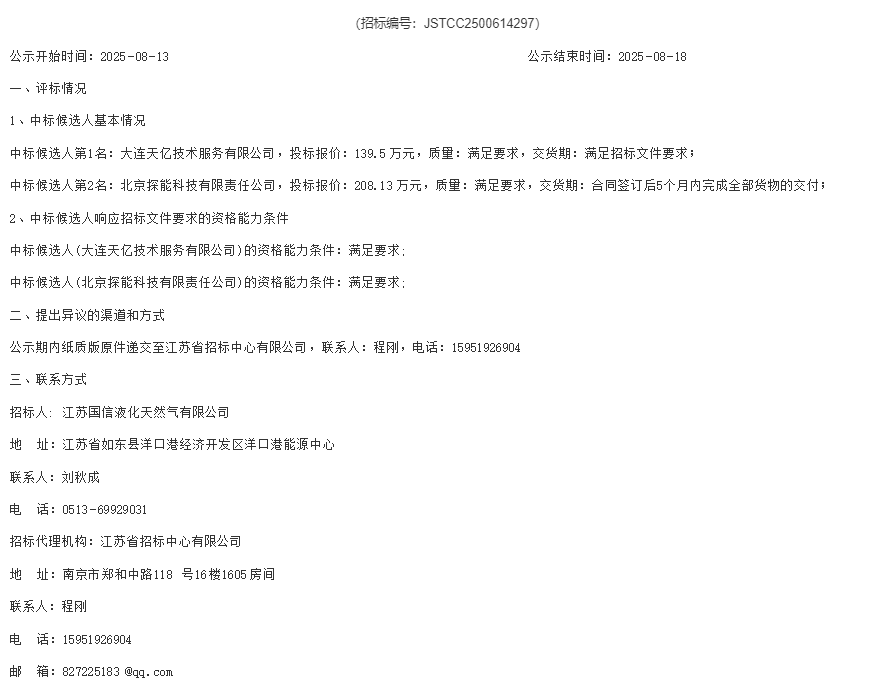 江苏省液化天然气储运调峰工程项目槽车在线分析仪采购评标结果公示