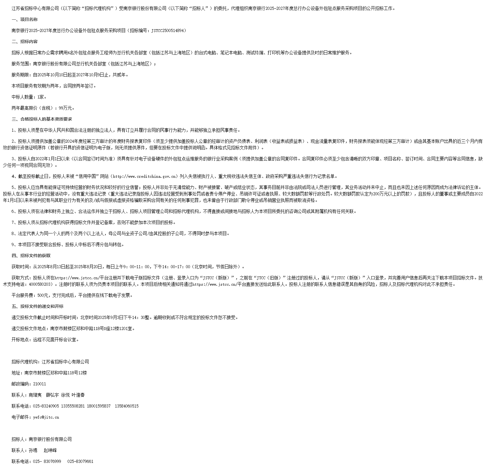 江苏省招标中心有限公司(以下简称“招标代理机构”)受南京银行股份有限公司(以下简称“招标人”)的委托,代理组织南京银行*********年度总行办公设备外包驻点服务采购项目的公开招标工作。