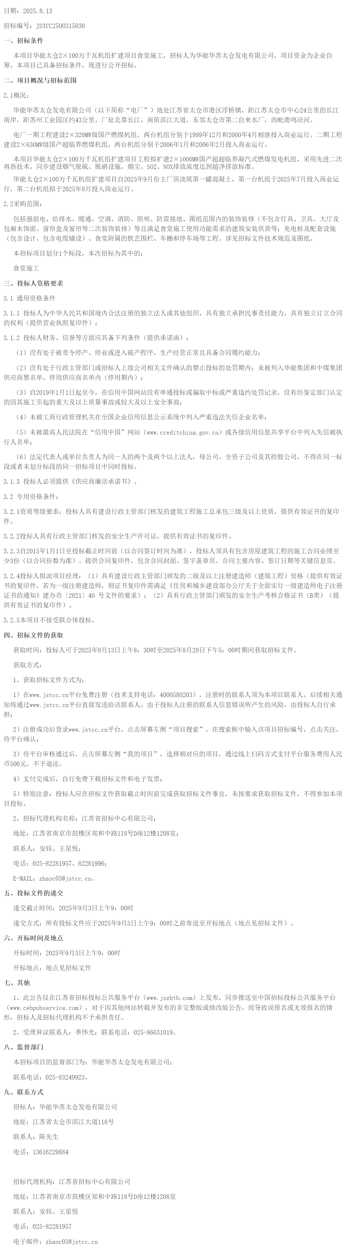华能太仓*×***万千瓦机组扩建项目食堂施工招标公告(***************)