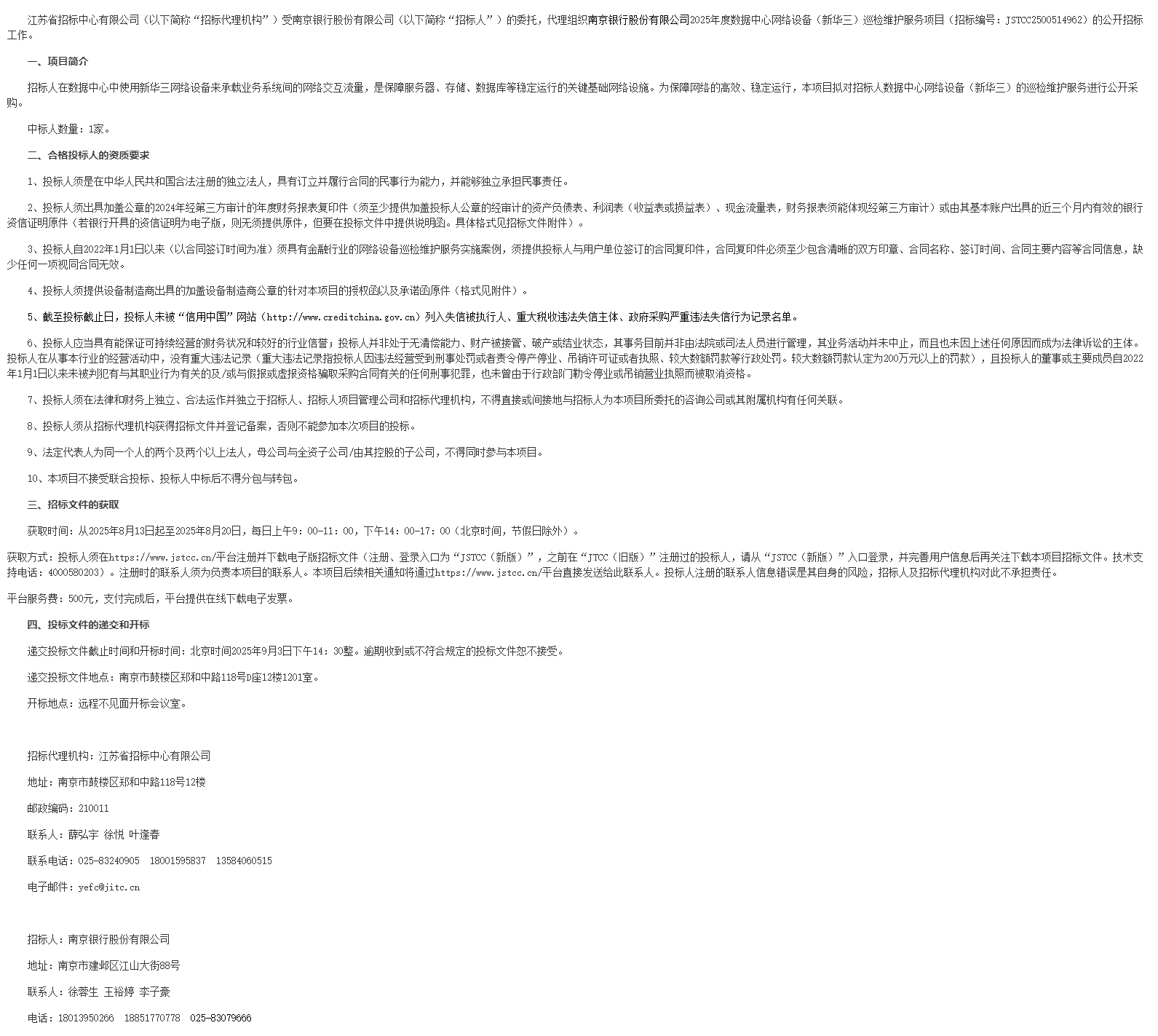 江苏省招标中心有限公司(以下简称“招标代理机构”)受南京银行股份有限公司(以下简称“招标人”)的委托,代理组织南京银行股份有限公司****年度数据中心网络设备(新华三)巡检维护服务项目(招标编号:***************)的公开招标工作。