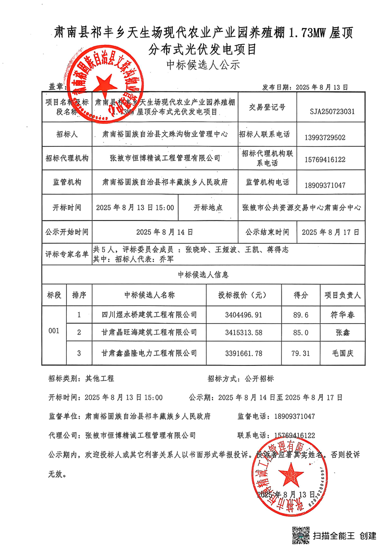 [肃南县]肃南县祁丰乡天生场现代农业产业园养殖棚1.73MW屋顶分布式光伏发电项目中标候选人公示交易结果公示