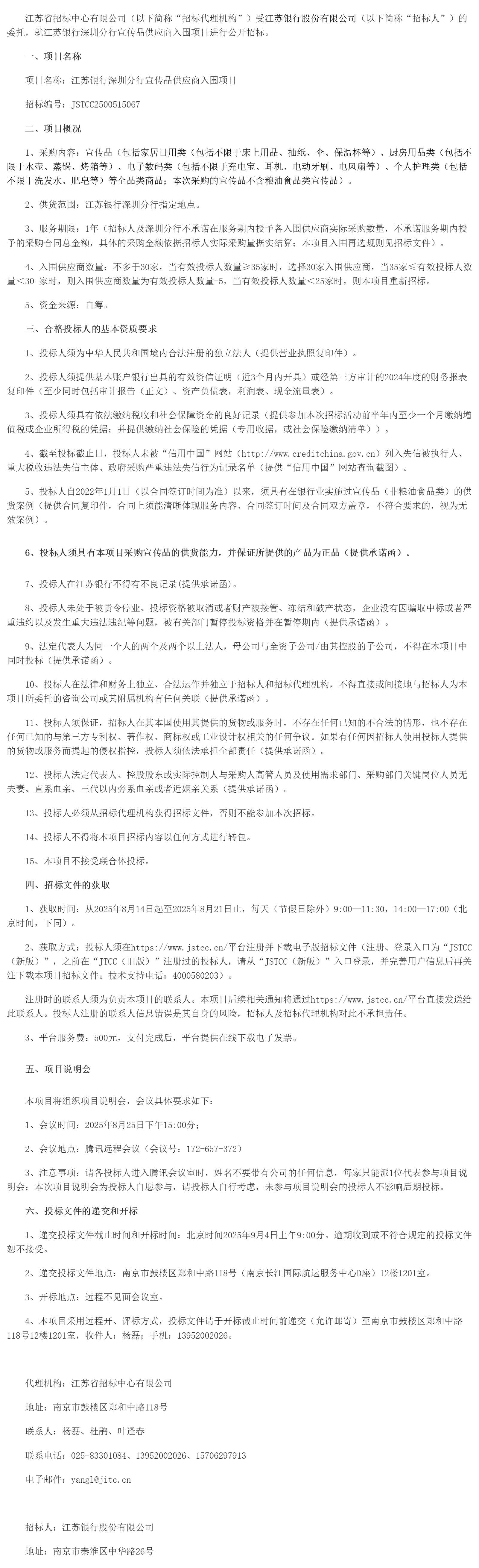 江苏银行深圳分行宣传品供应商入围项目招标公告