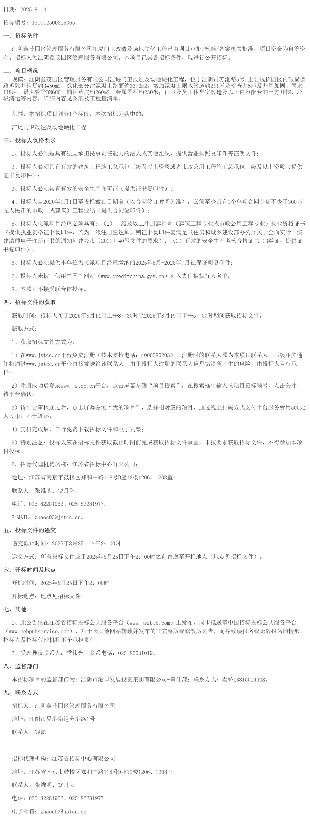 江阴鑫茂园区管理服务有限公司江堤门卫改造及场地硬化工程招标公告(***************)