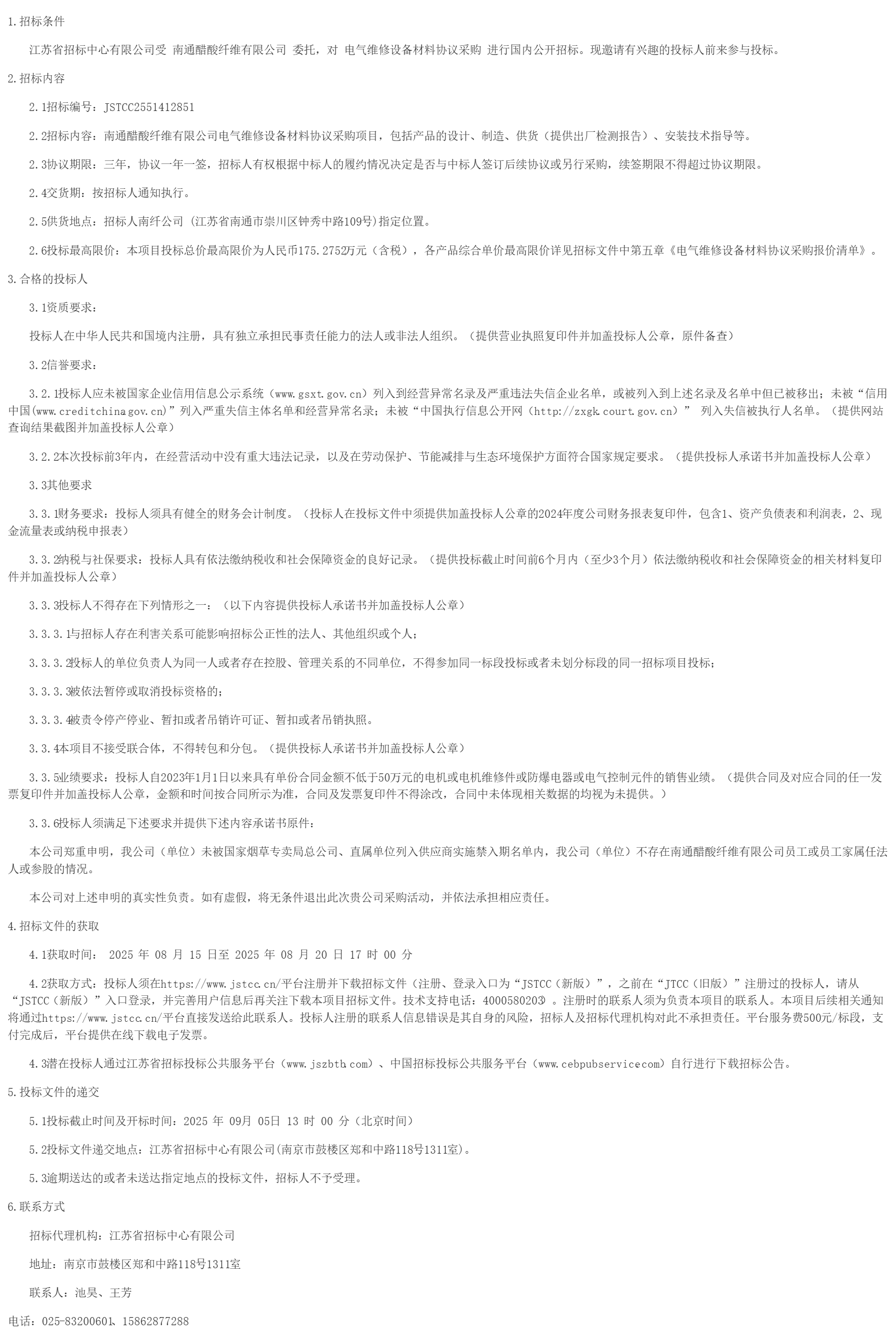 *.*招标内容:南通醋酸纤维有限公司电气维修设备材料协议采购项目,包括产品的设计、制造、供货(提供出厂检测报告)、安装技术指导等。