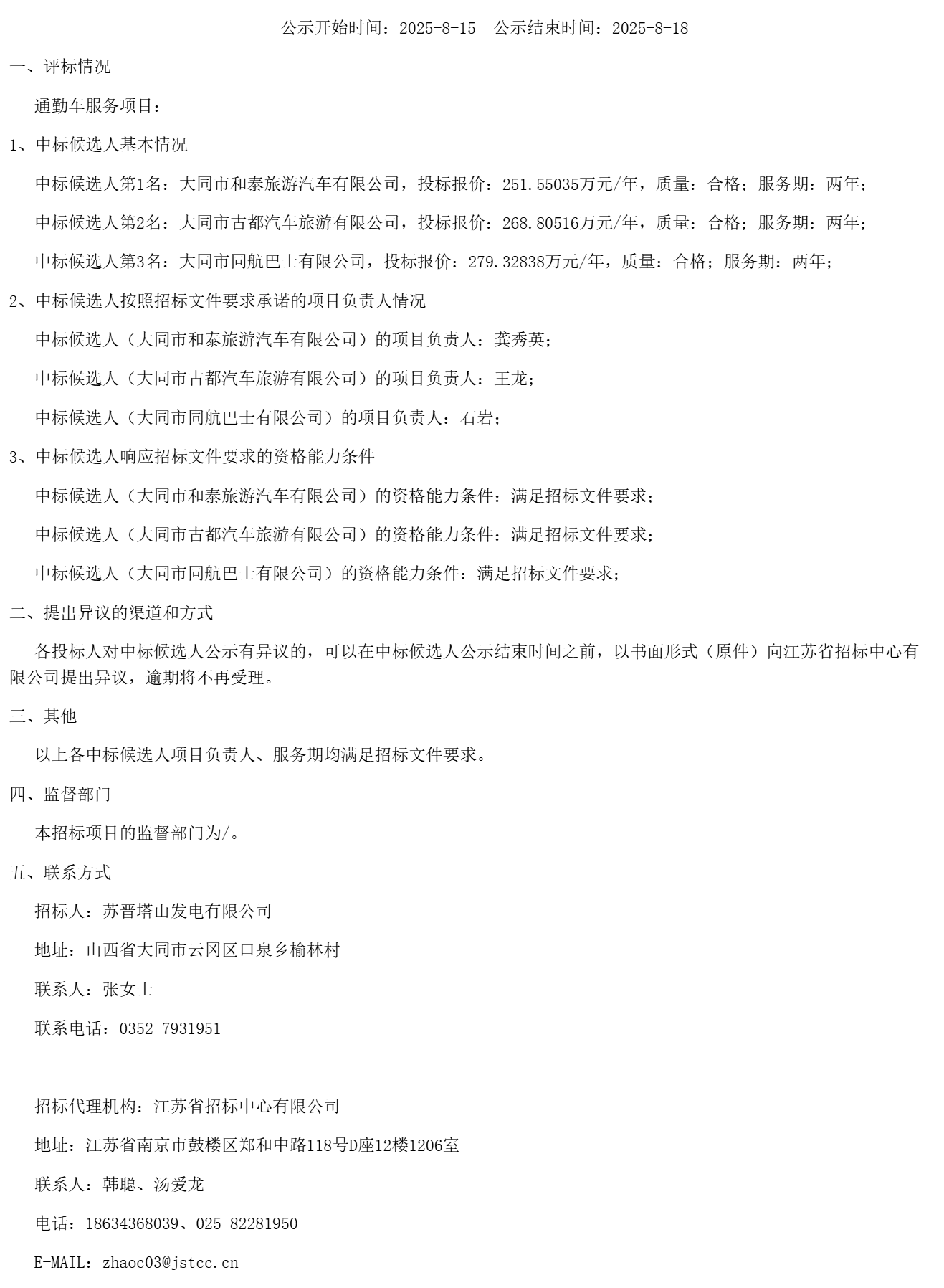 苏晋塔山发电有限公司通勤车服务项目中标候选人公示(***************)
