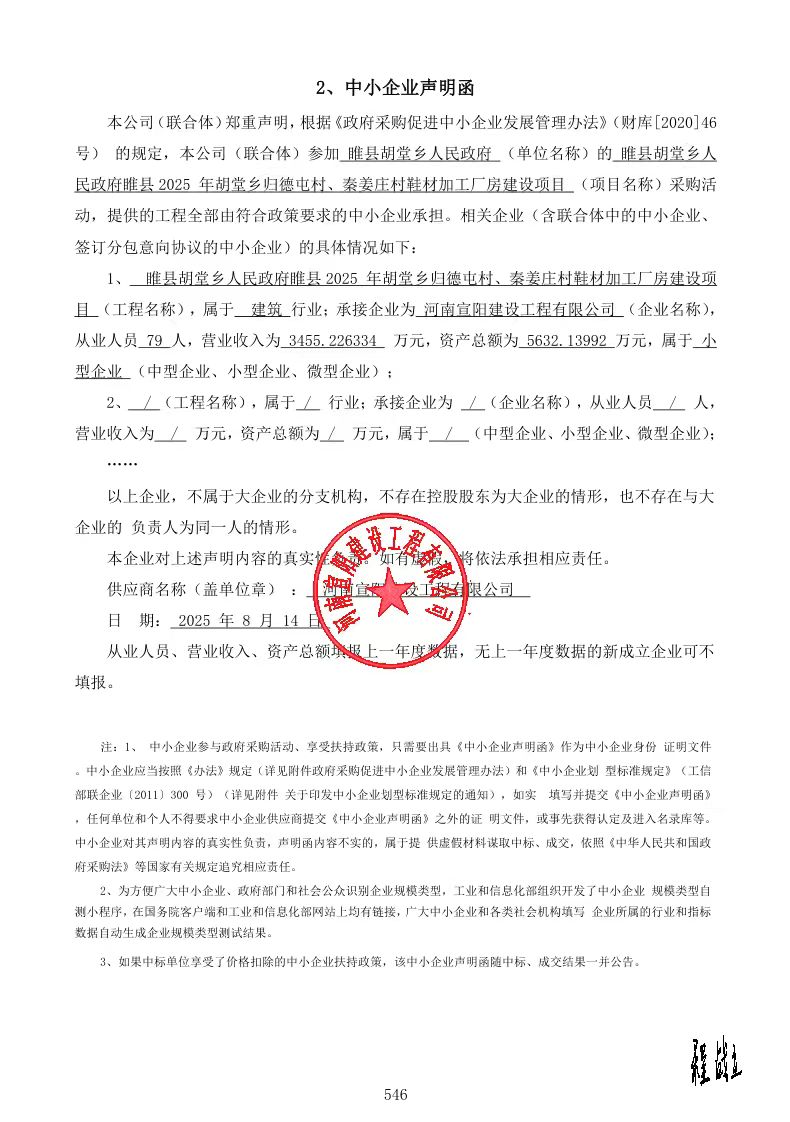 睢县胡堂乡人民政府睢县2025年胡堂乡归德屯村、秦姜庄村鞋材加工厂房建设项目结果公告