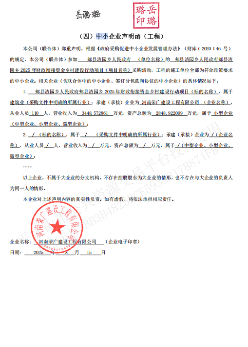 【平公资采2025720号】郏县渣园乡人民政府郏县渣园乡2025年财政衔接资金乡村建设行动项目(第一标段)成交公告