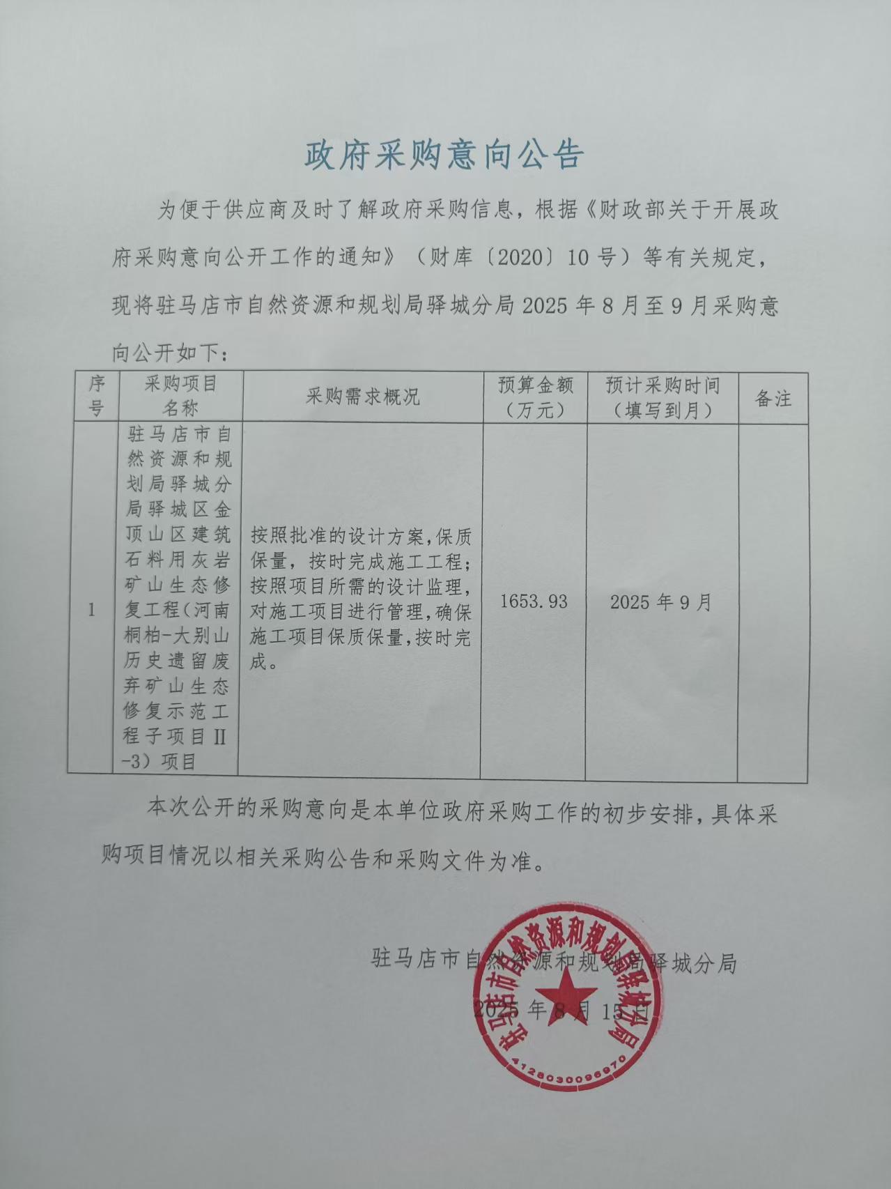 驻马店市自然资源和规划局驿城分局2025年8至9月政府采购意向