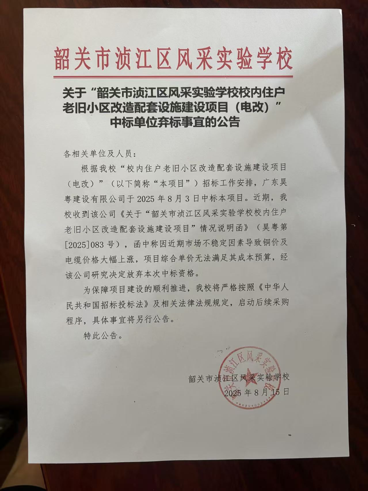 韶关市浈江区风采实验学校校内住户老旧小区改造配套设施建设项目终止公告