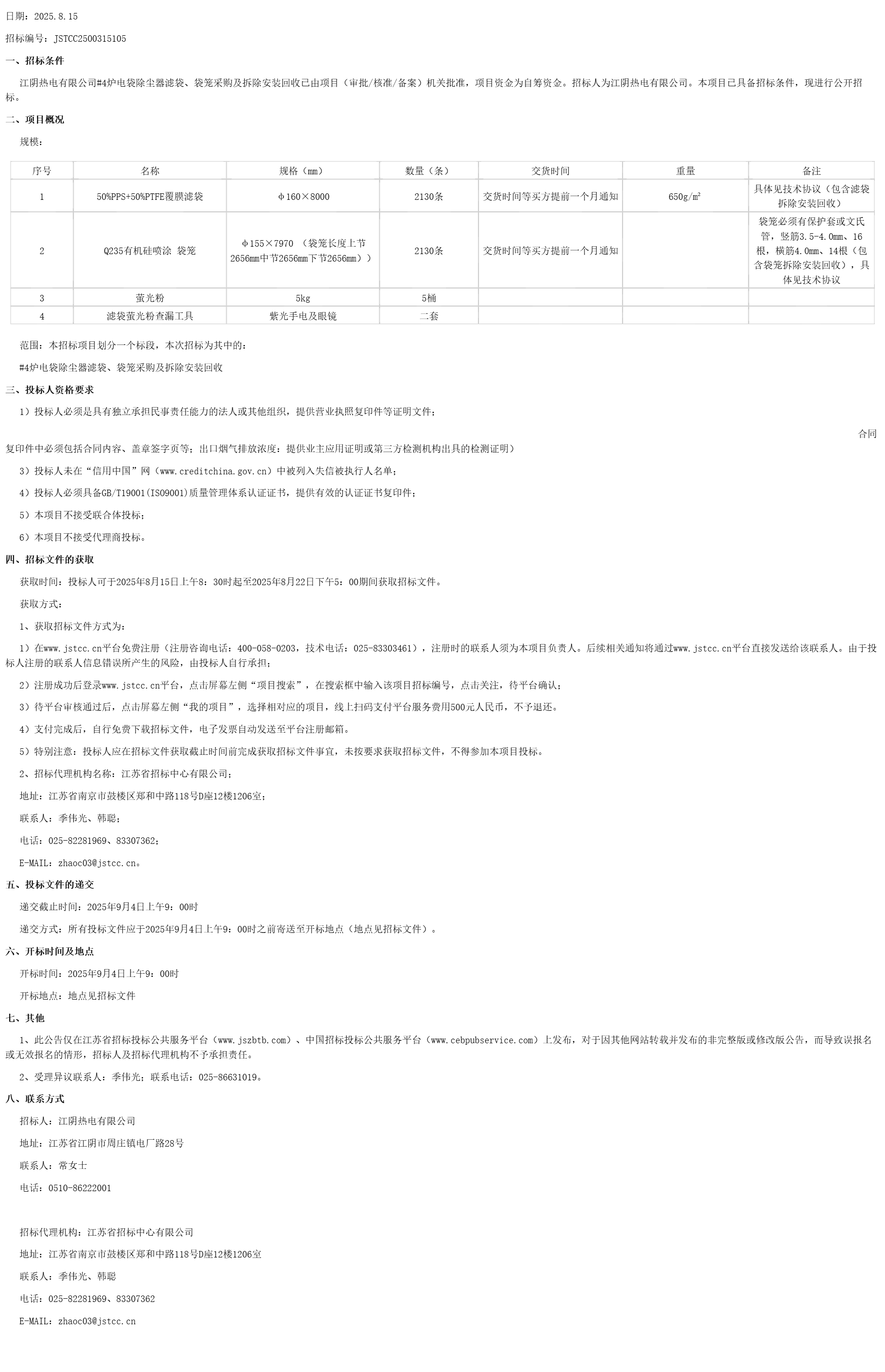 江阴热电有限公司#*炉电袋除尘器滤袋、袋笼采购及拆除安装回收已由项目(审批/核准/备案)机关批准,项目资金为自筹资金。招标人为江阴热电有限公司。本项目已具备招标条件,现进行公开招标。