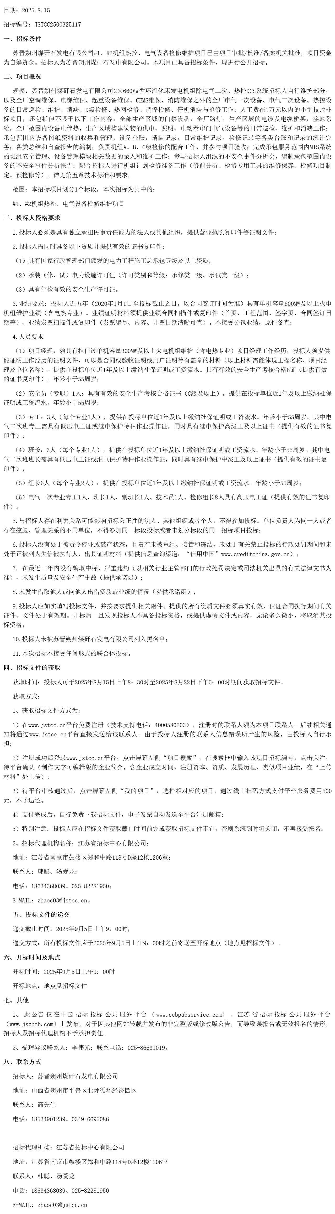 苏晋朔州煤矸石发电有限公司#1、#2 机组热控、电气设备检修维护项目招标公告(JSTCC2500325117)