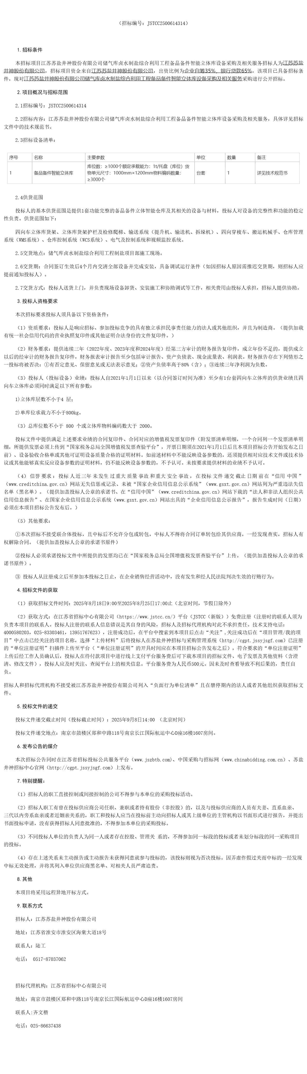 *.*招标内容:江苏苏盐井神股份有限公司储气库卤水制盐综合利用工程备品备件智能立体库设备采购及相关服务,具体详见招标文件中的技术规范书。